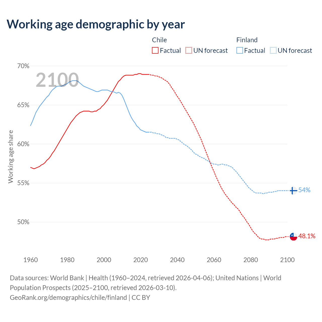 - Chile has 13.8M working age adults (aged 15-64) vs 3.46M in Finland.