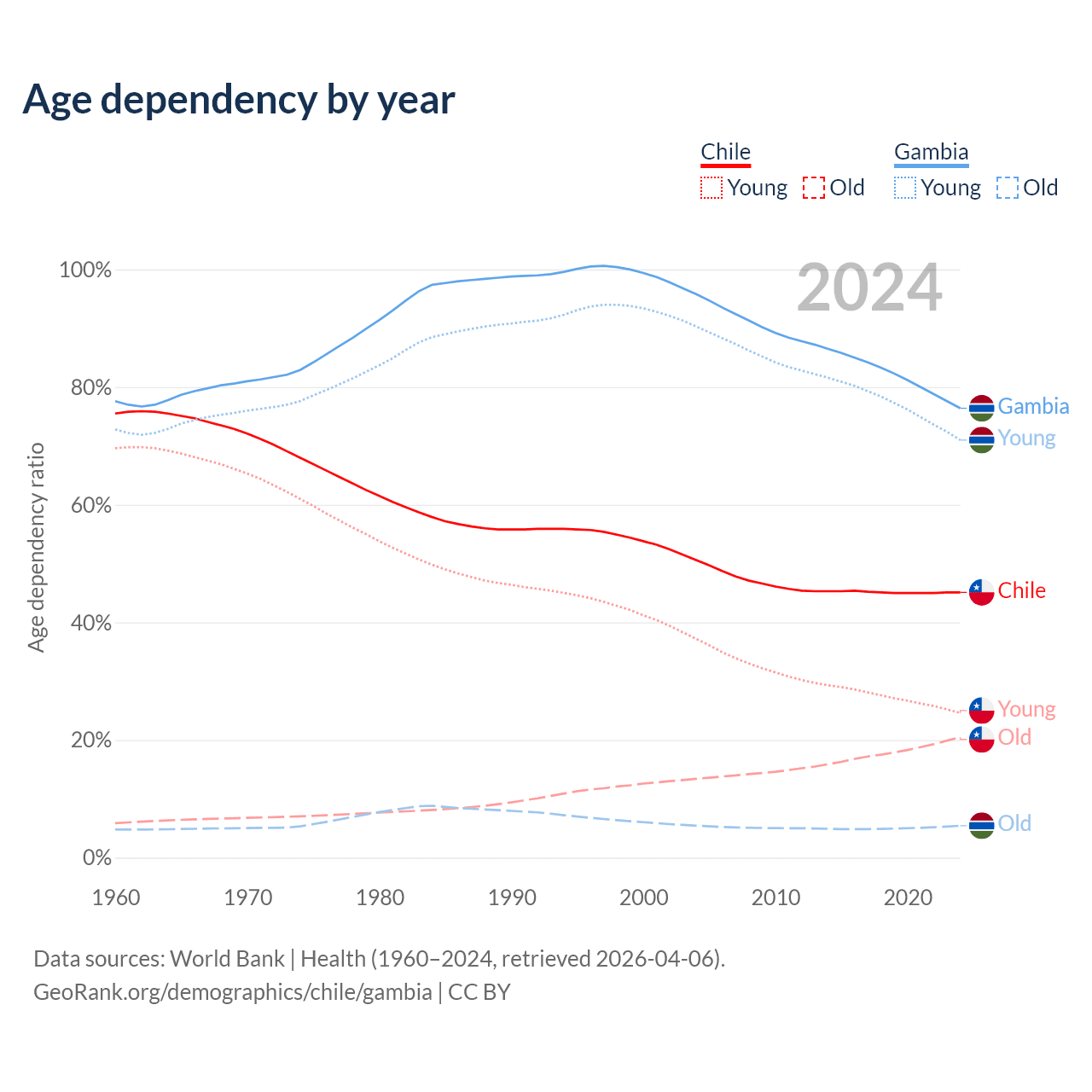 - The share of old-age demographic (65+) in Chile is 14.1% vs 3.08% in the Gambia.