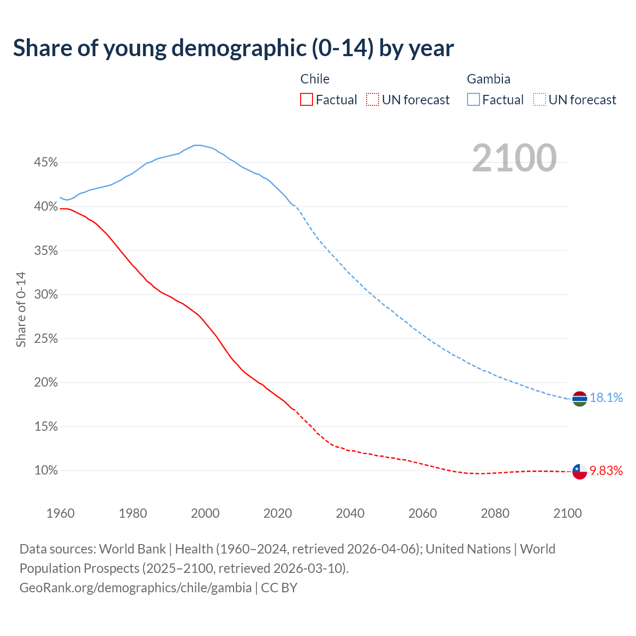 - The share of young demographic (0-15 years old) in Chile is 17% vs 40.2% in the Gambia.