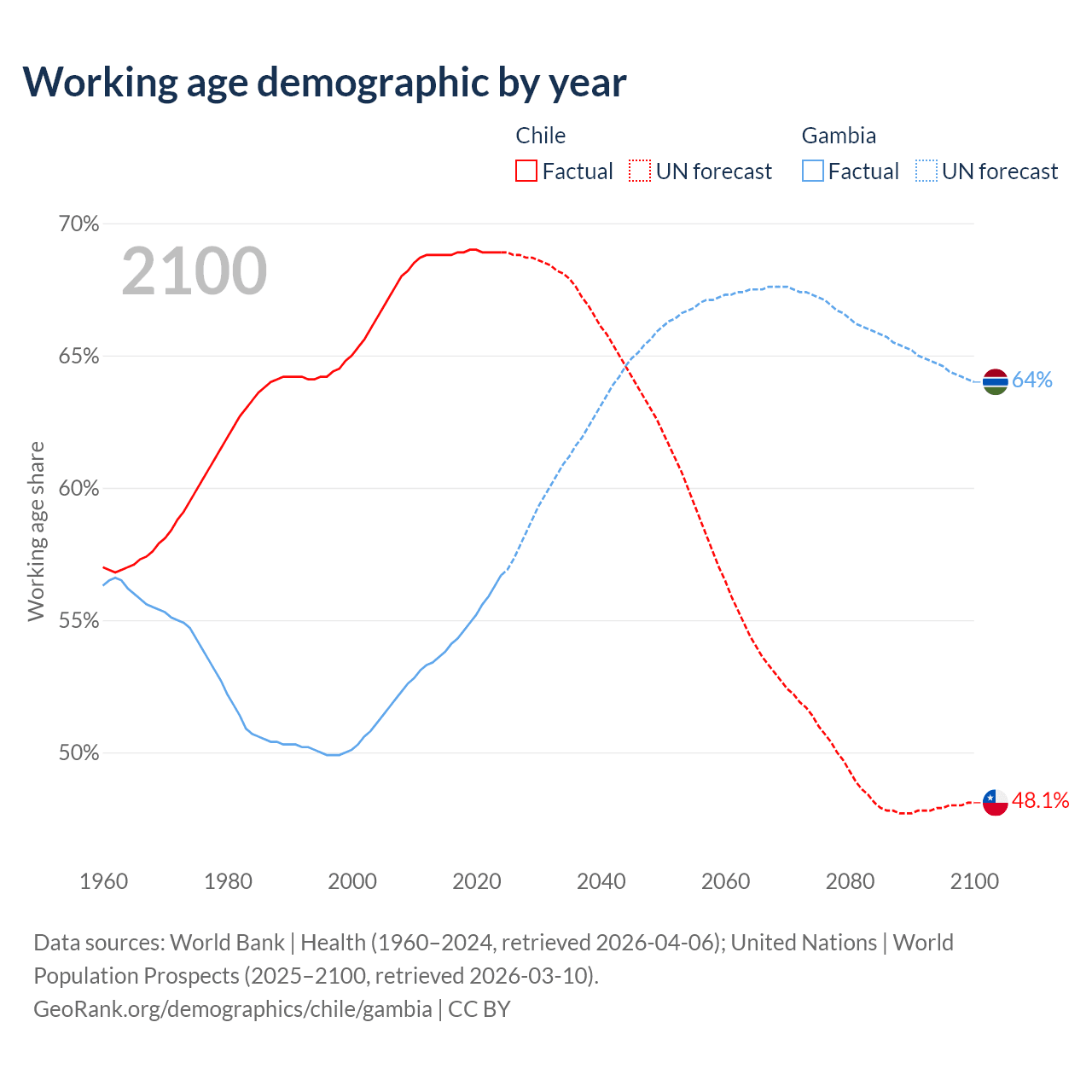 - Chile has 13.8M working age adults (aged 15-64) vs 1.64M in the Gambia.