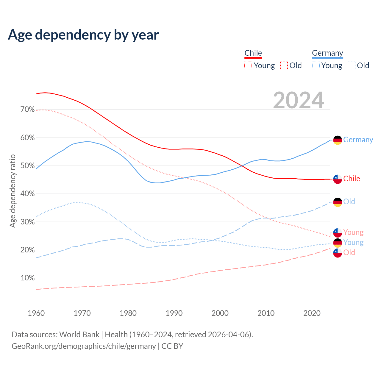 - Chile is ranked 61/196 by median age (oldest to youngest) vs 9/196 for Germany.