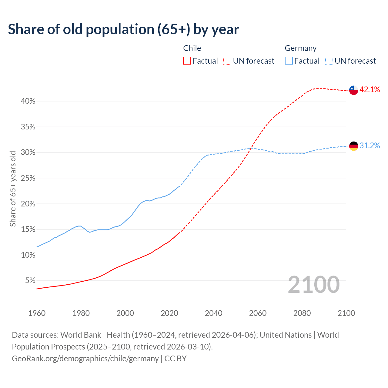 The share of older people aged 65 and over is 14.1% in Chile and 23.2% in Germany. Life expectancy in Chile compared to Germany .