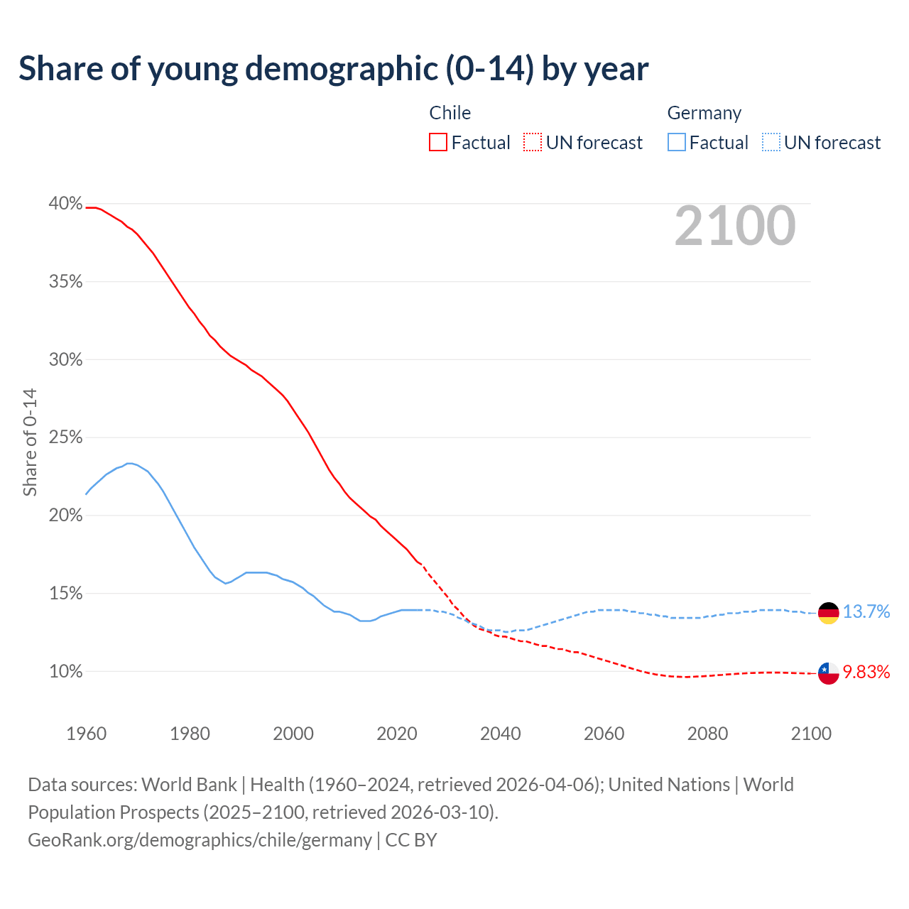 - The share of young demographic (0-15 years old) in Chile is 17% vs 13.9% in Germany.