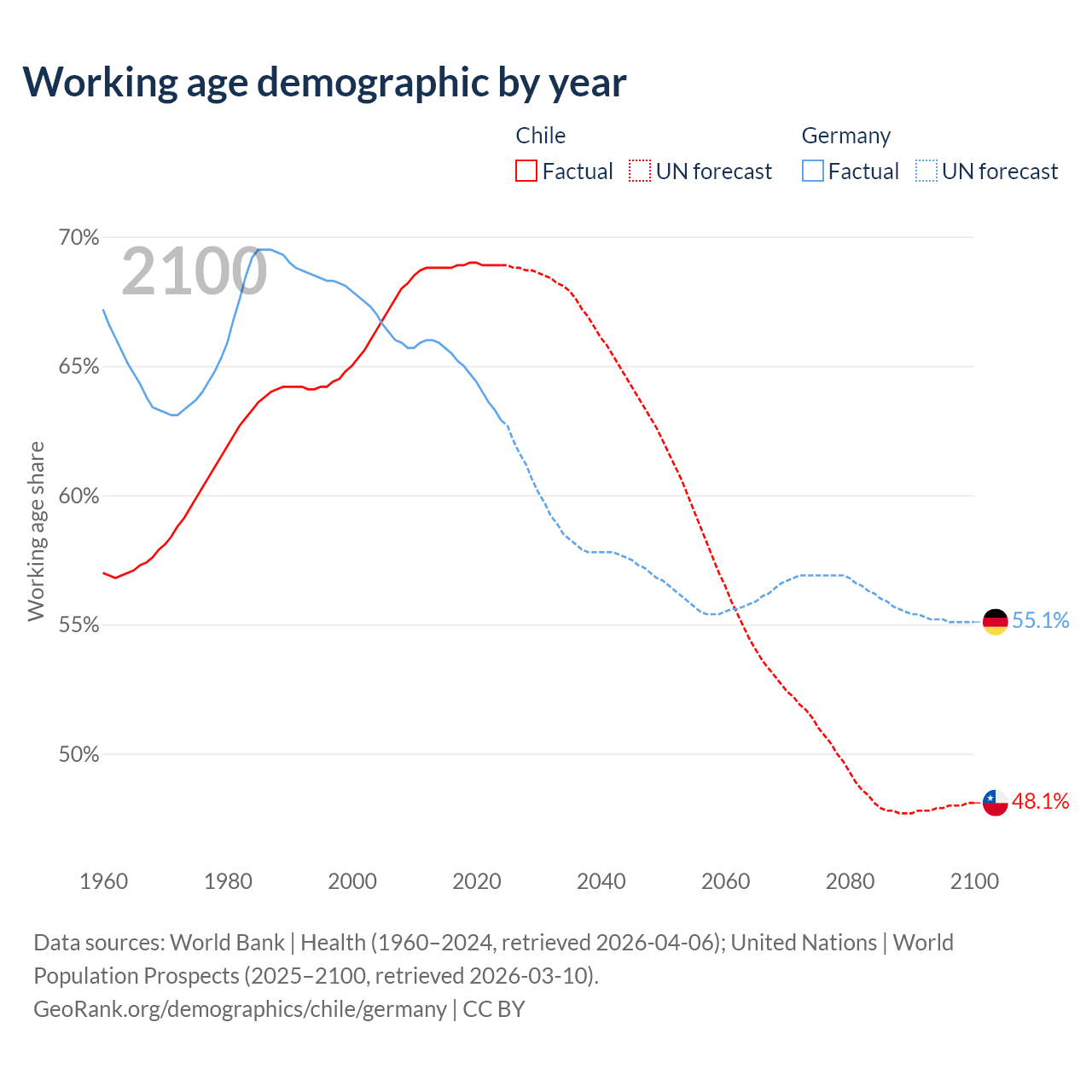 - Chile has 13.8M working age adults (aged 15-64) vs 51.9M in Germany.