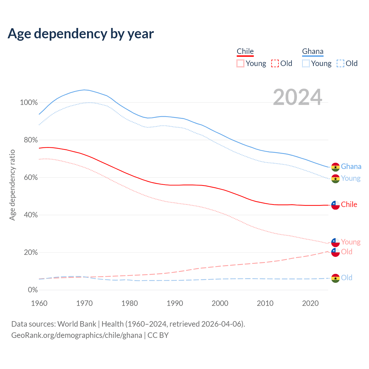 The share of older people aged 65 and over is 14.1% in Chile and 3.71% in Ghana. Life expectancy in Chile compared to Ghana .