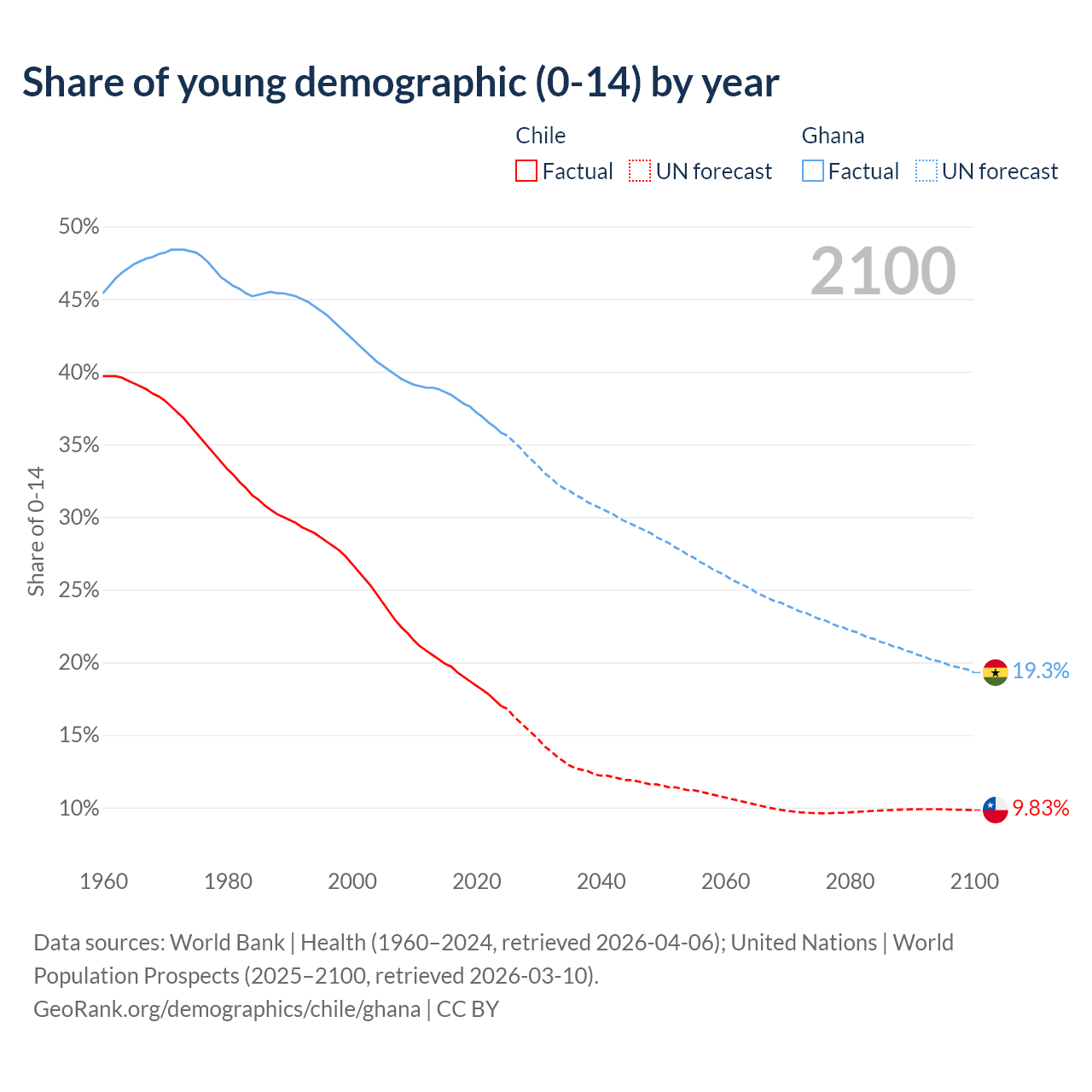 - The share of young demographic (0-15 years old) in Chile is 17% vs 35.8% in Ghana.