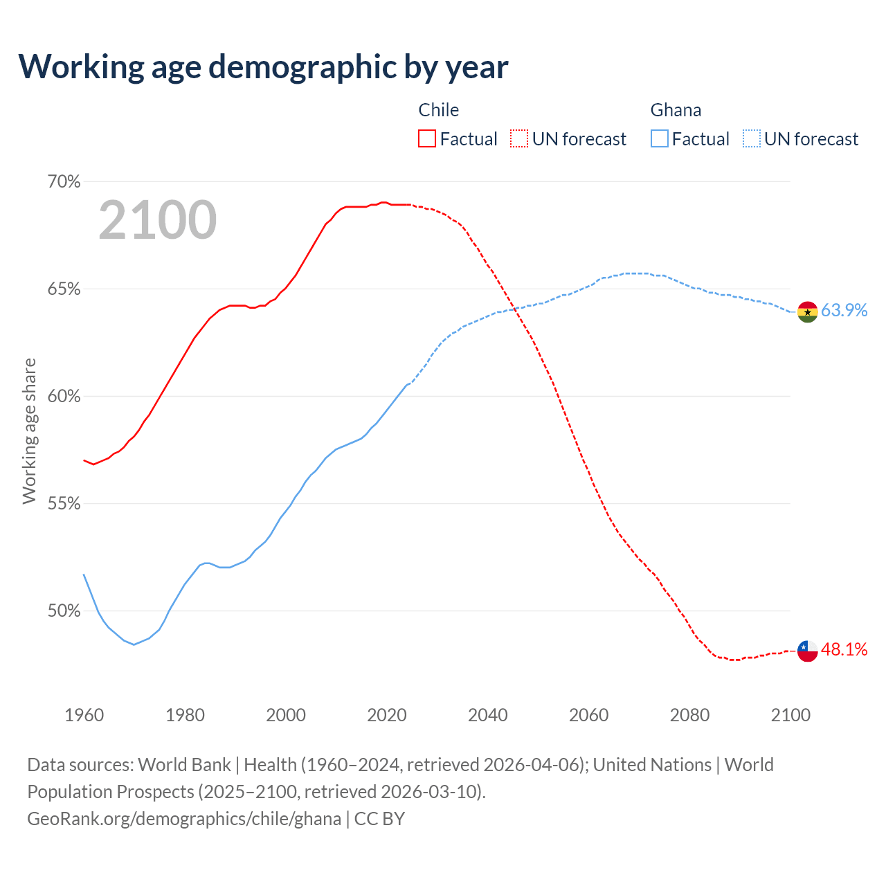 - Chile has 13.8M working age adults (aged 15-64) vs 21.7M in Ghana.