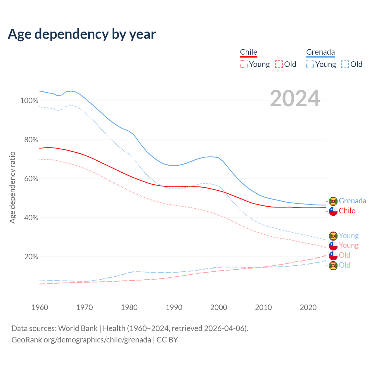 - The share of young demographic (0-15 years old) in Chile is 17% vs 19.4% in Grenada.