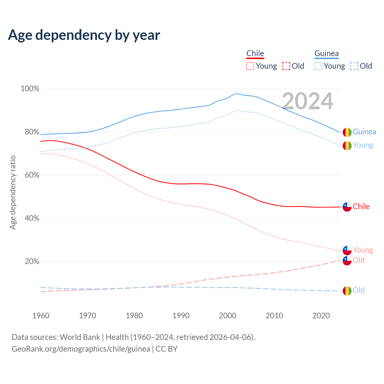 - Chile is ranked 61/196 by median age (oldest to youngest) vs 176/196 for Guinea.