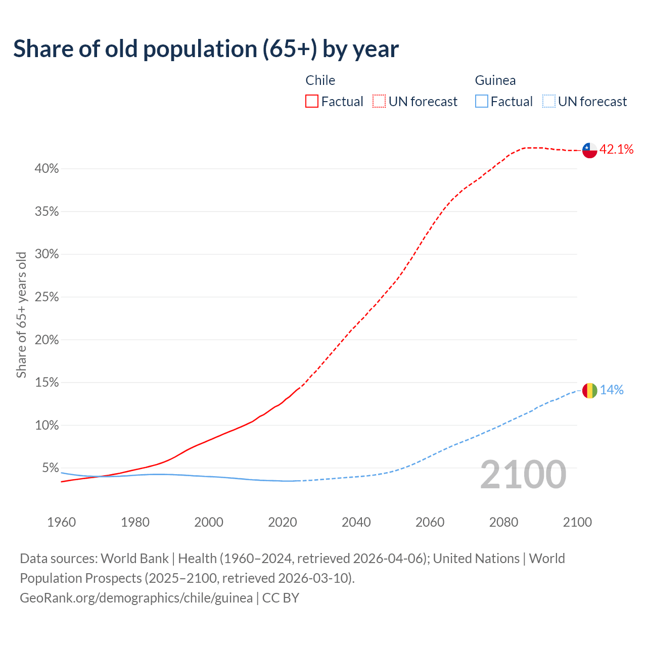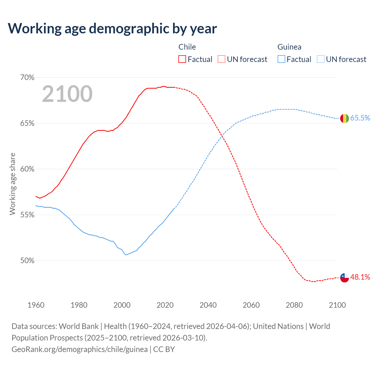 Median age Chile vs Guinea, 1960-2100