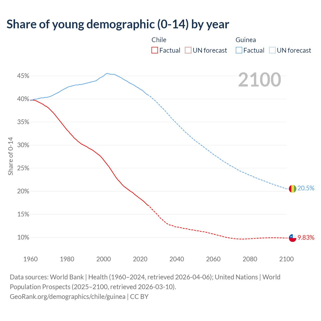 - The share of young demographic (0-15 years old) in Chile is 17% vs 40.9% in Guinea.