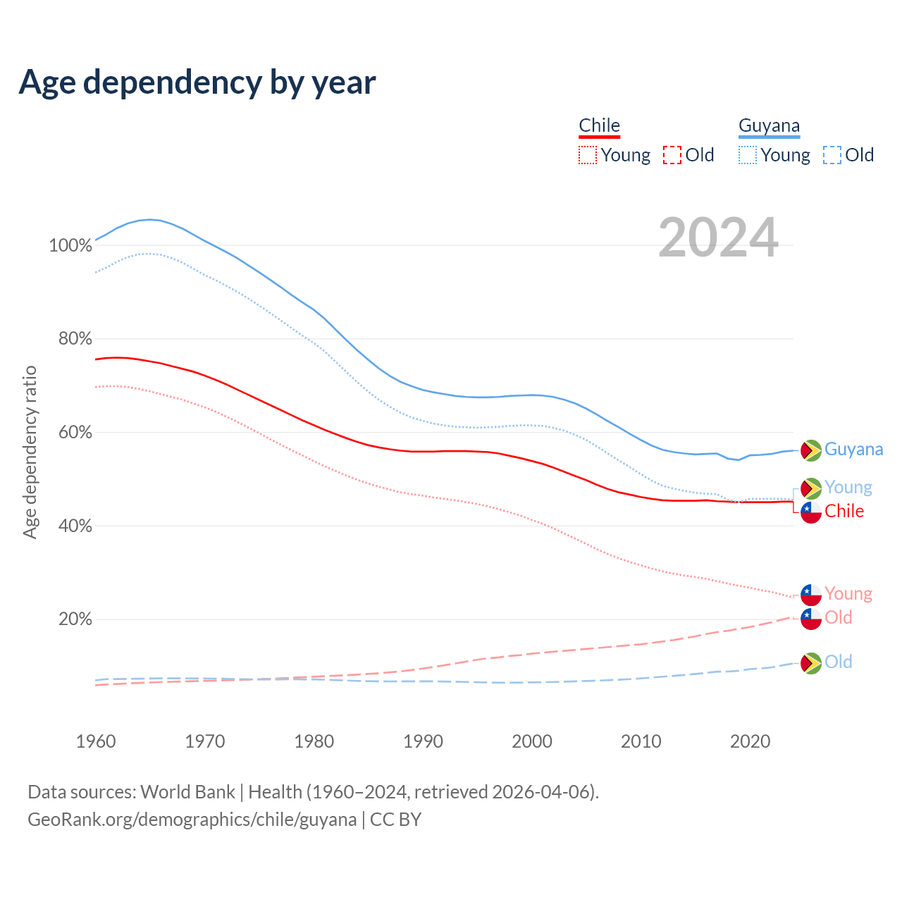 - Chile is ranked 61/196 by median age (oldest to youngest) vs 122/196 for Guyana.