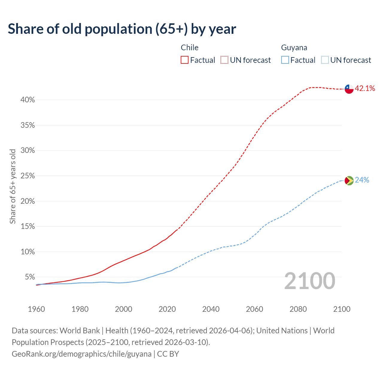 - The share of old-age demographic (65+) in Chile is 14.1% vs 6.73% in Guyana.