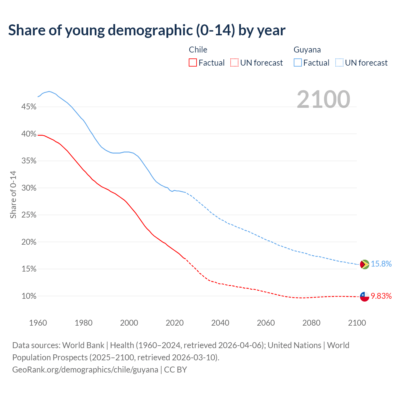 - The share of young demographic (0-15 years old) in Chile is 17% vs 29.2% in Guyana.
