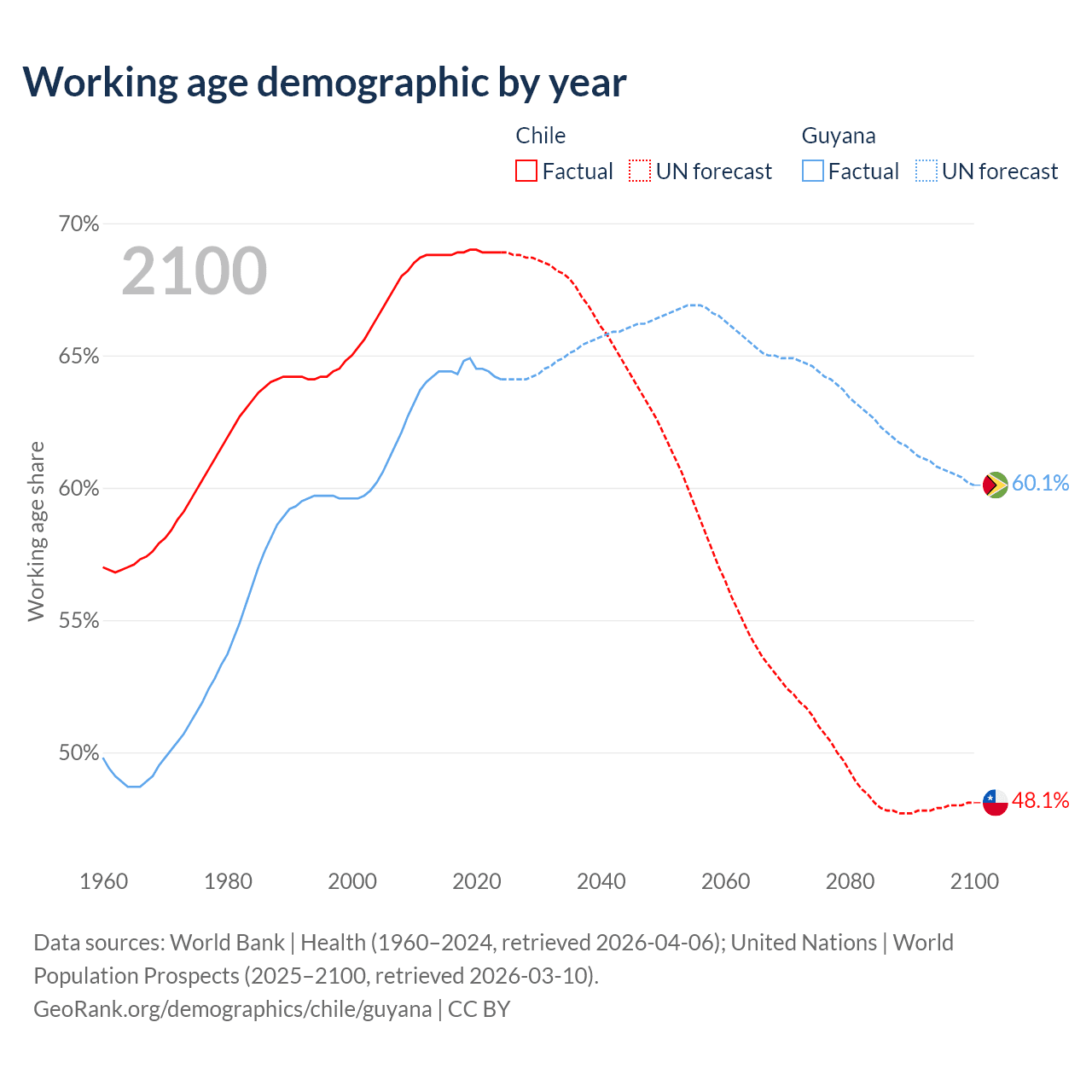 Median age Chile vs Guyana, 1960-2100