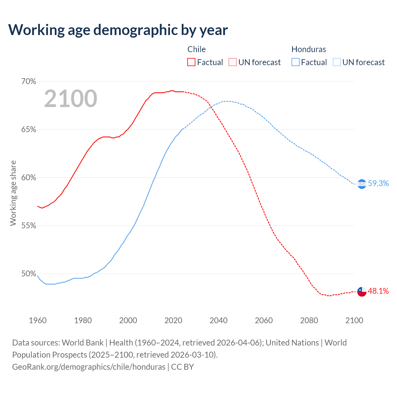 - Chile has 13.8M working age adults (aged 15-64) vs 7.3M in Honduras.