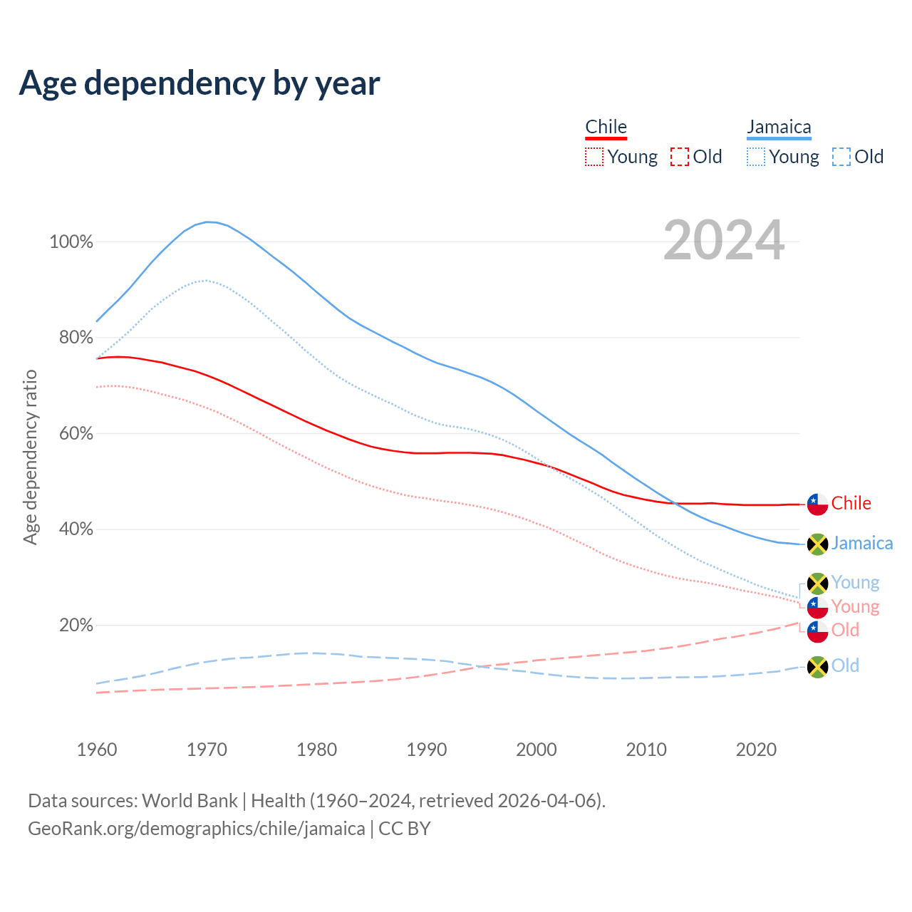 Data sources: World Bank | Health (1960–2024, retrieved 2026-04-06); U.S. Census Bureau (1960–2024, retrieved 2026-02-08).