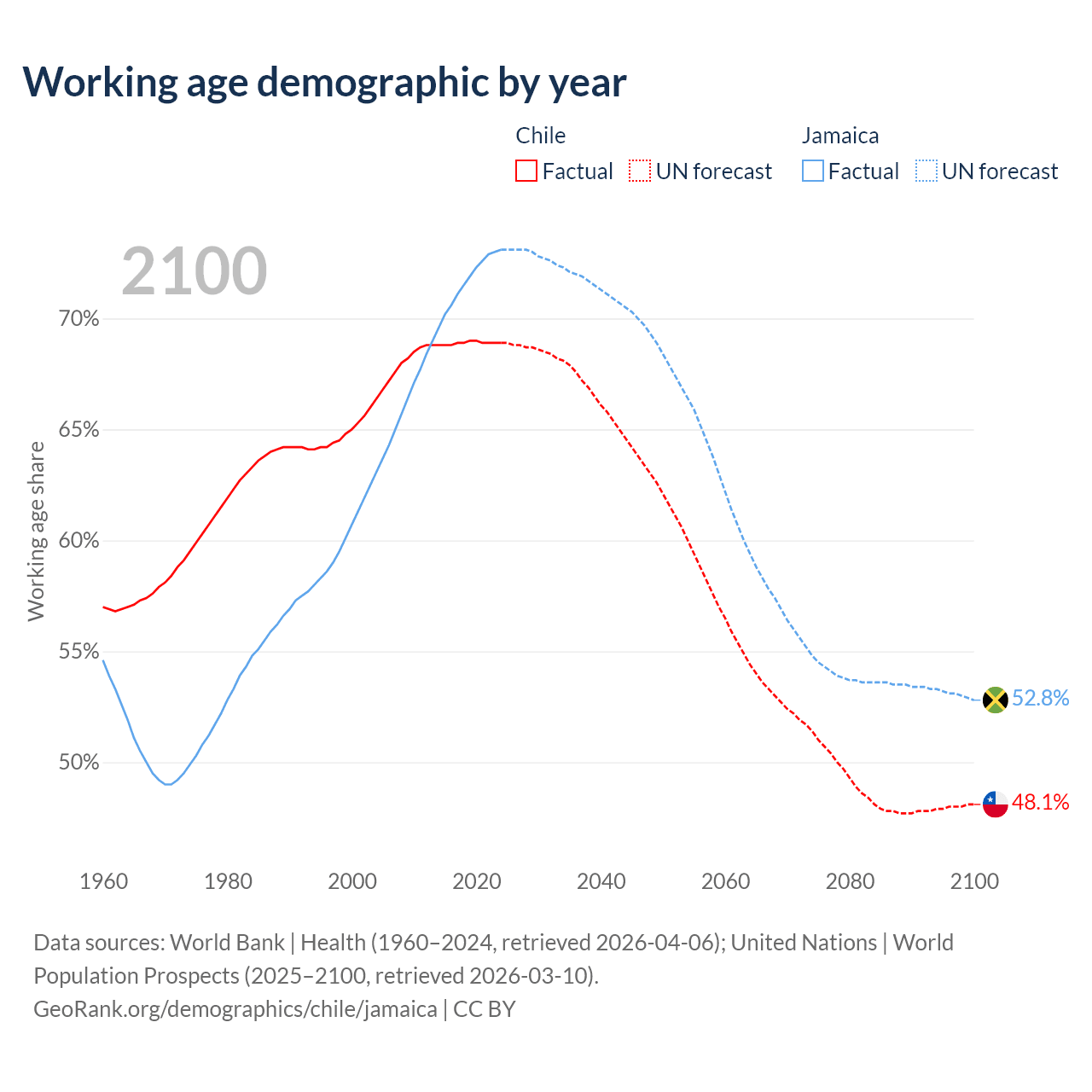 Median age Chile vs Jamaica, 1960-2100