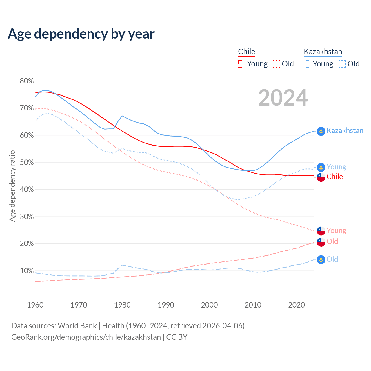- Chile is ranked 61/196 by median age (oldest to youngest) vs 99/196 for Kazakhstan.