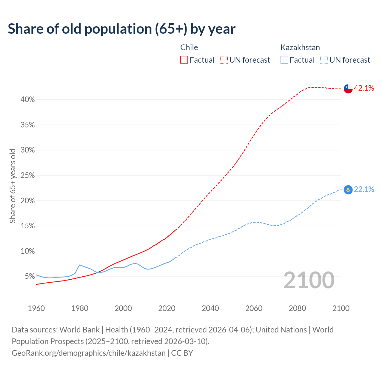 - The share of old-age demographic (65+) in Chile is 14.1% vs 8.65% in Kazakhstan.