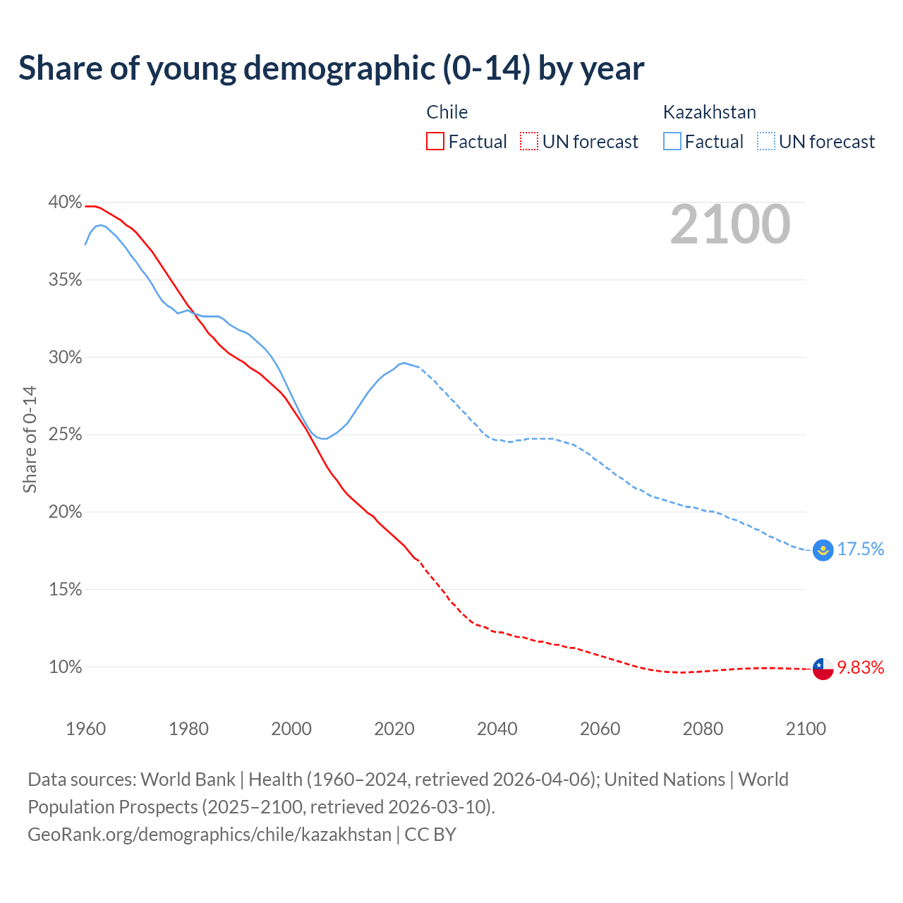 - The share of young demographic (0-15 years old) in Chile is 17% vs 29.4% in Kazakhstan.