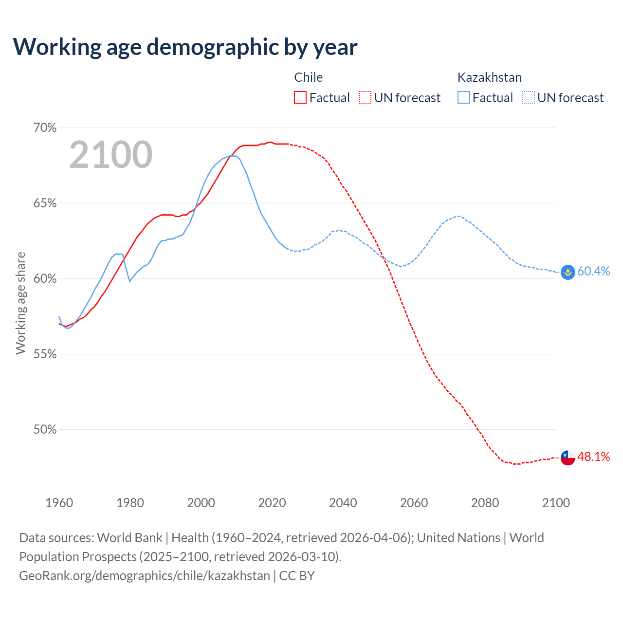 - Chile has 13.8M working age adults (aged 15-64) vs 13.1M in Kazakhstan.