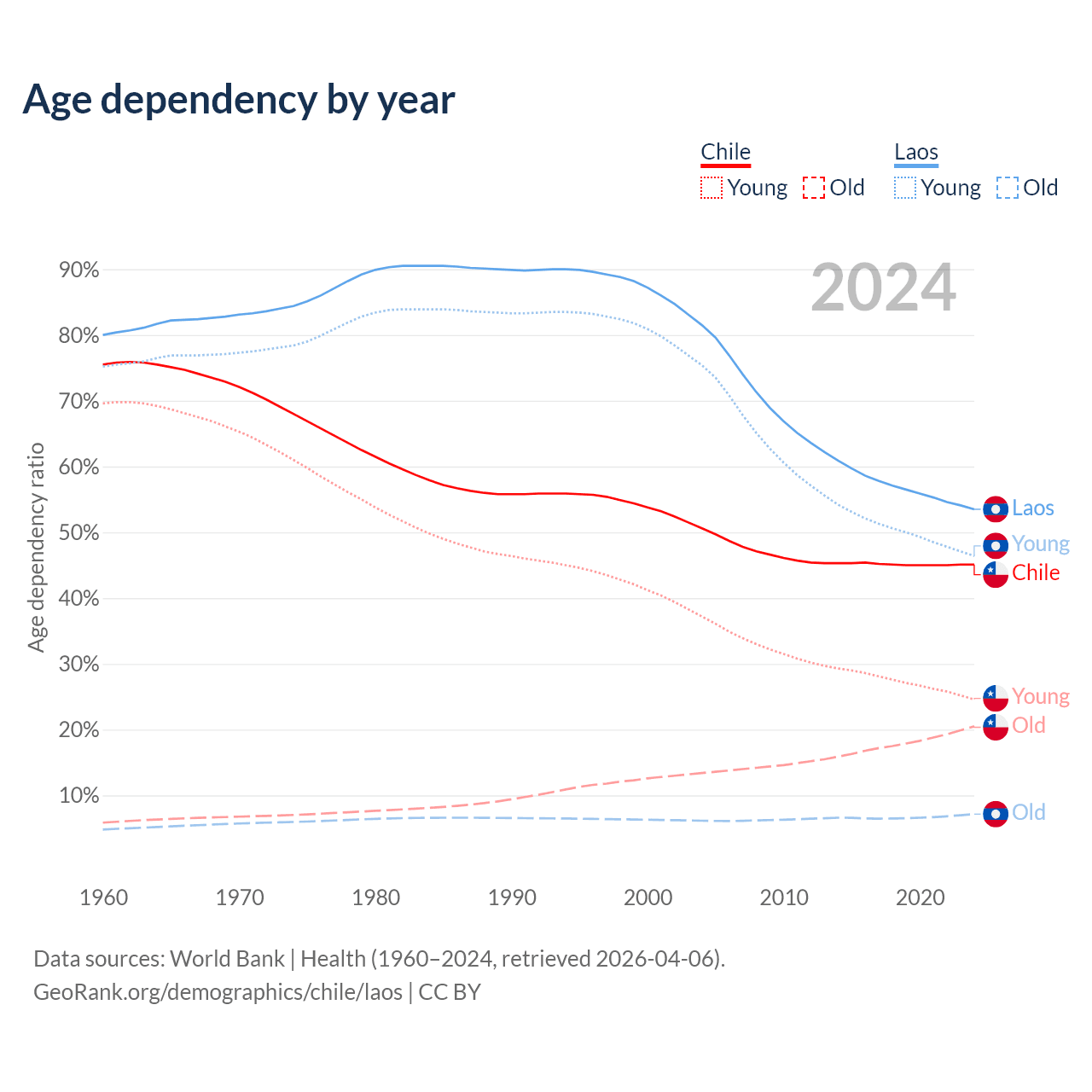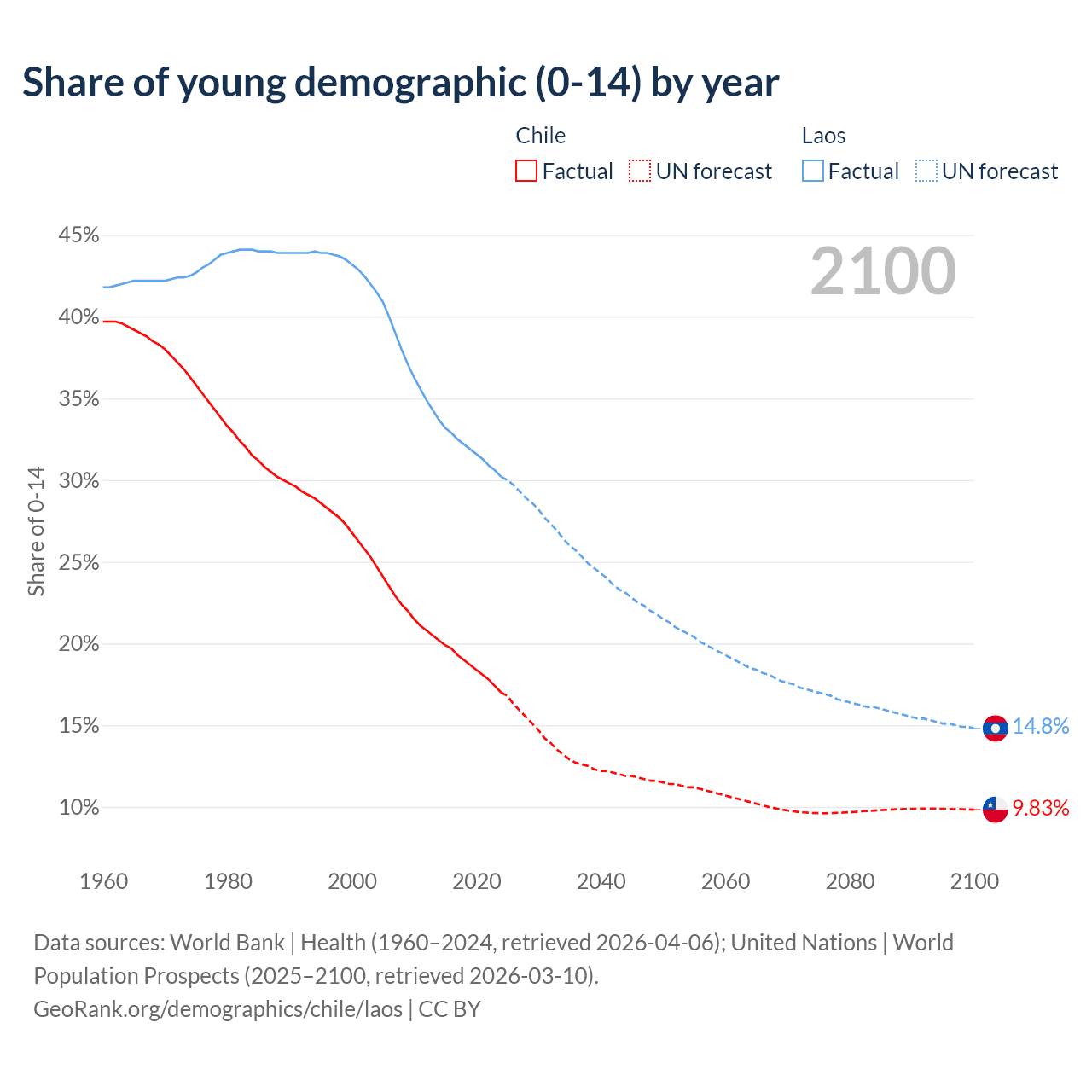 - The share of young demographic (0-15 years old) in Chile is 17% vs 30.2% in Laos.