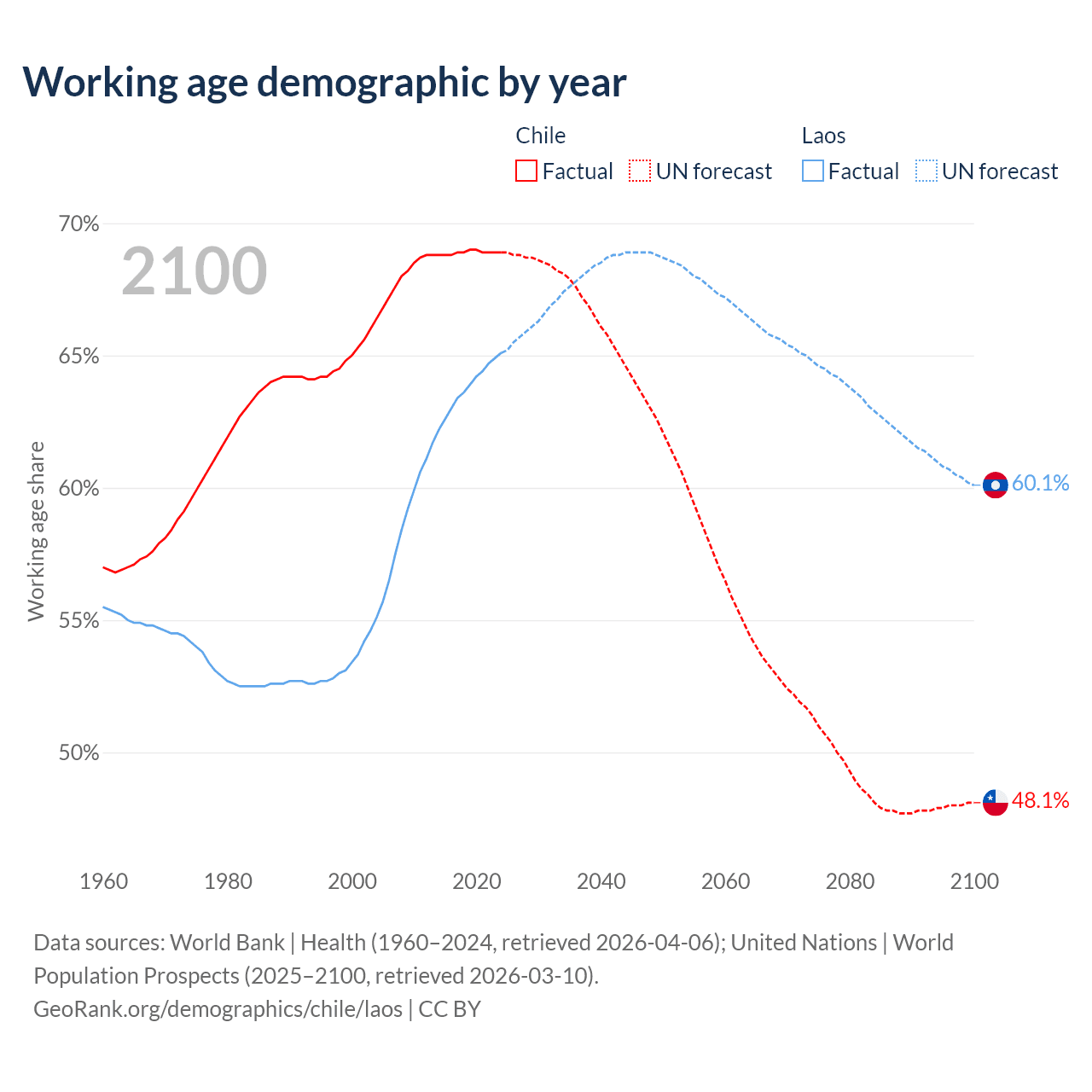 - As of 2026, the population of Chile is 20M vs 8M in Laos - 2.5 times difference.