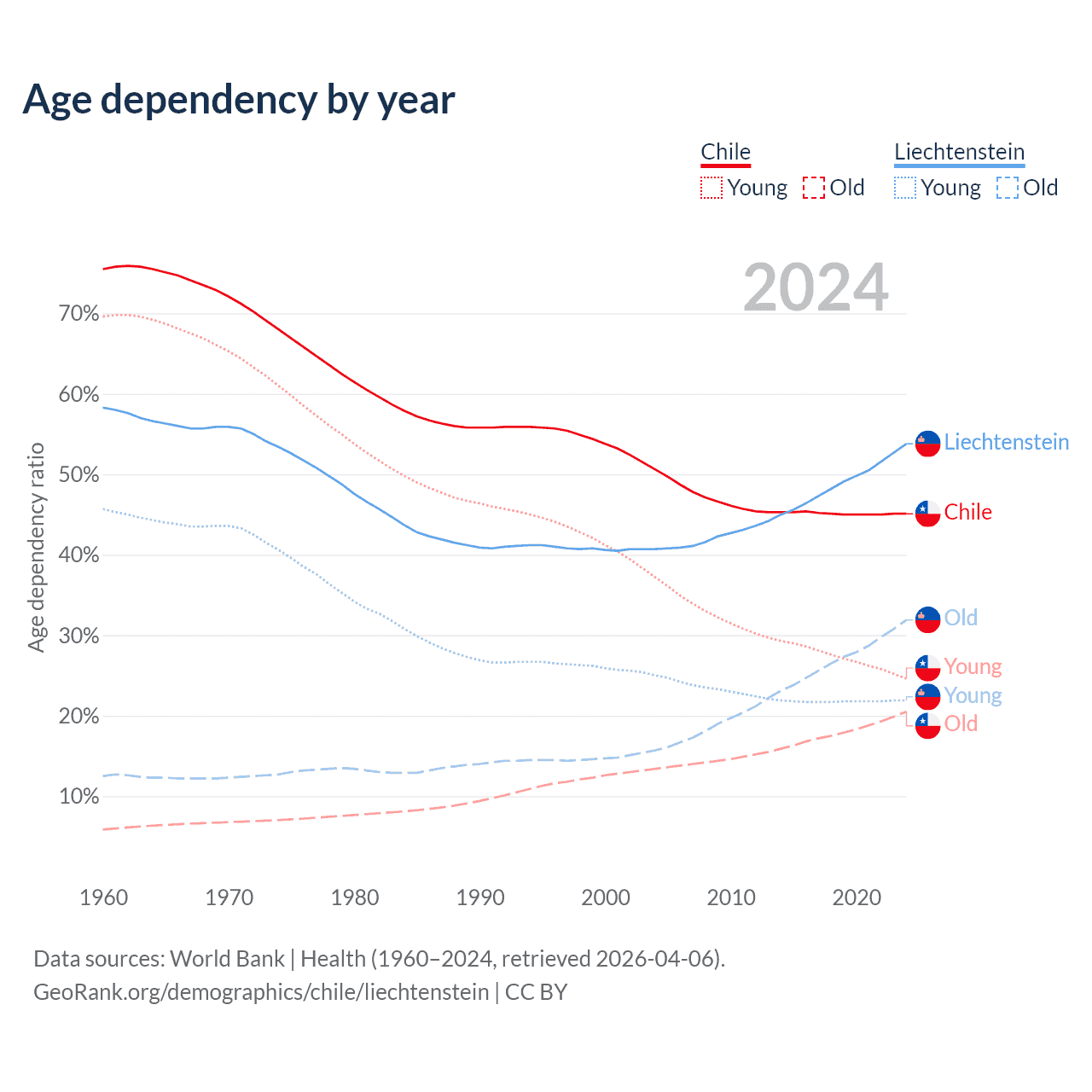 - The share of old-age demographic (65+) in Chile is 14.1% vs 20.7% in Liechtenstein.