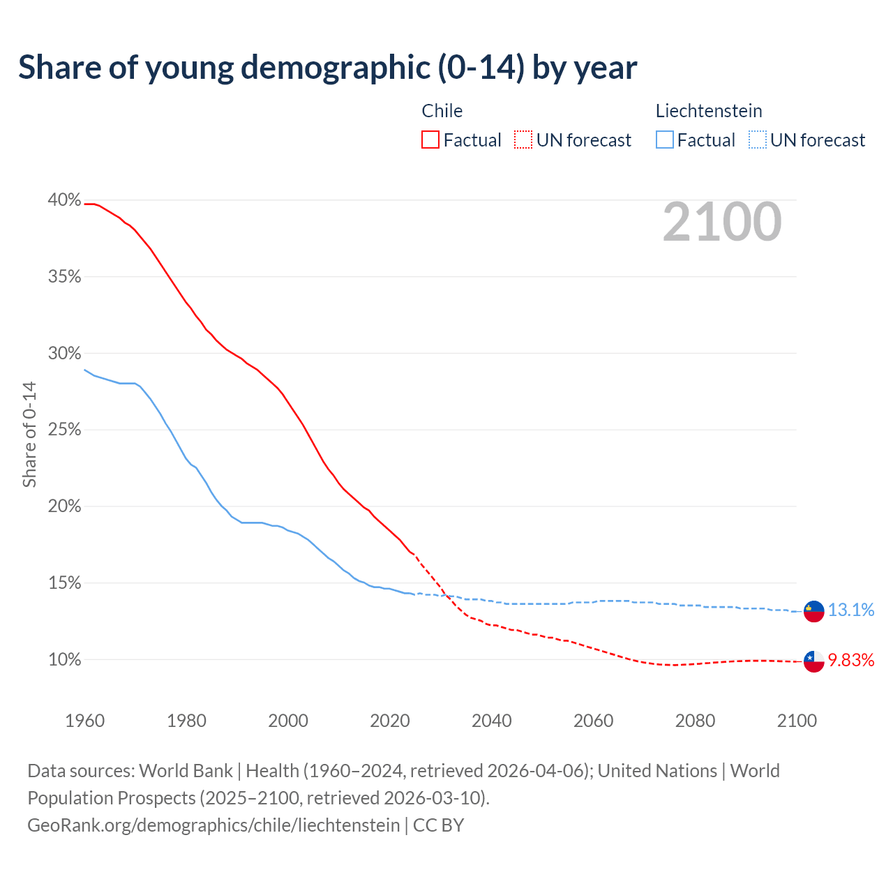 - The share of young demographic (0-15 years old) in Chile is 17% vs 14.3% in Liechtenstein.