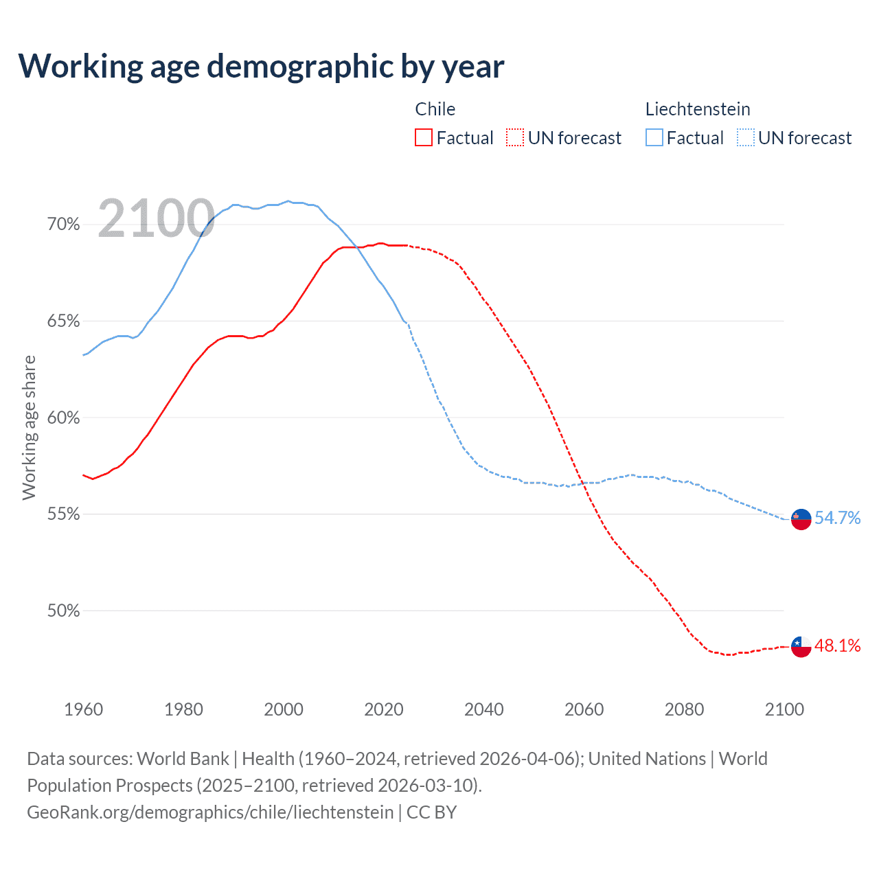 Median age Chile vs Liechtenstein, 1960-2100