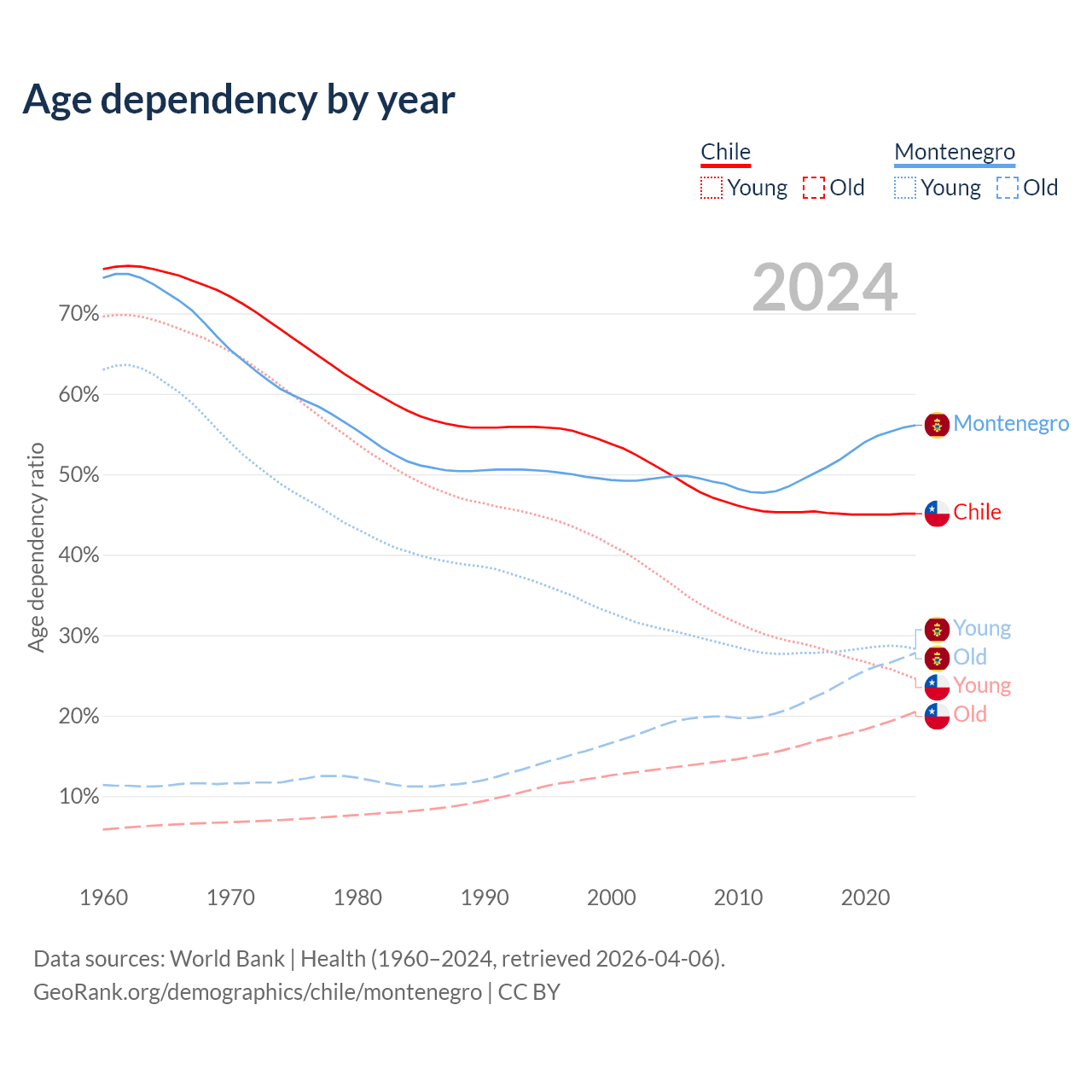 - Chile is ranked 61/196 by median age (oldest to youngest) vs 45/196 for Montenegro.