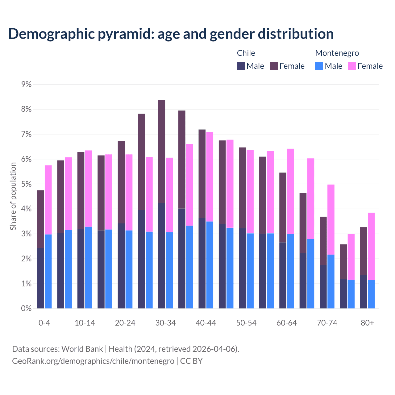 - The median age in Chile is 37.5 years compared to 40.6 years in Montenegro.