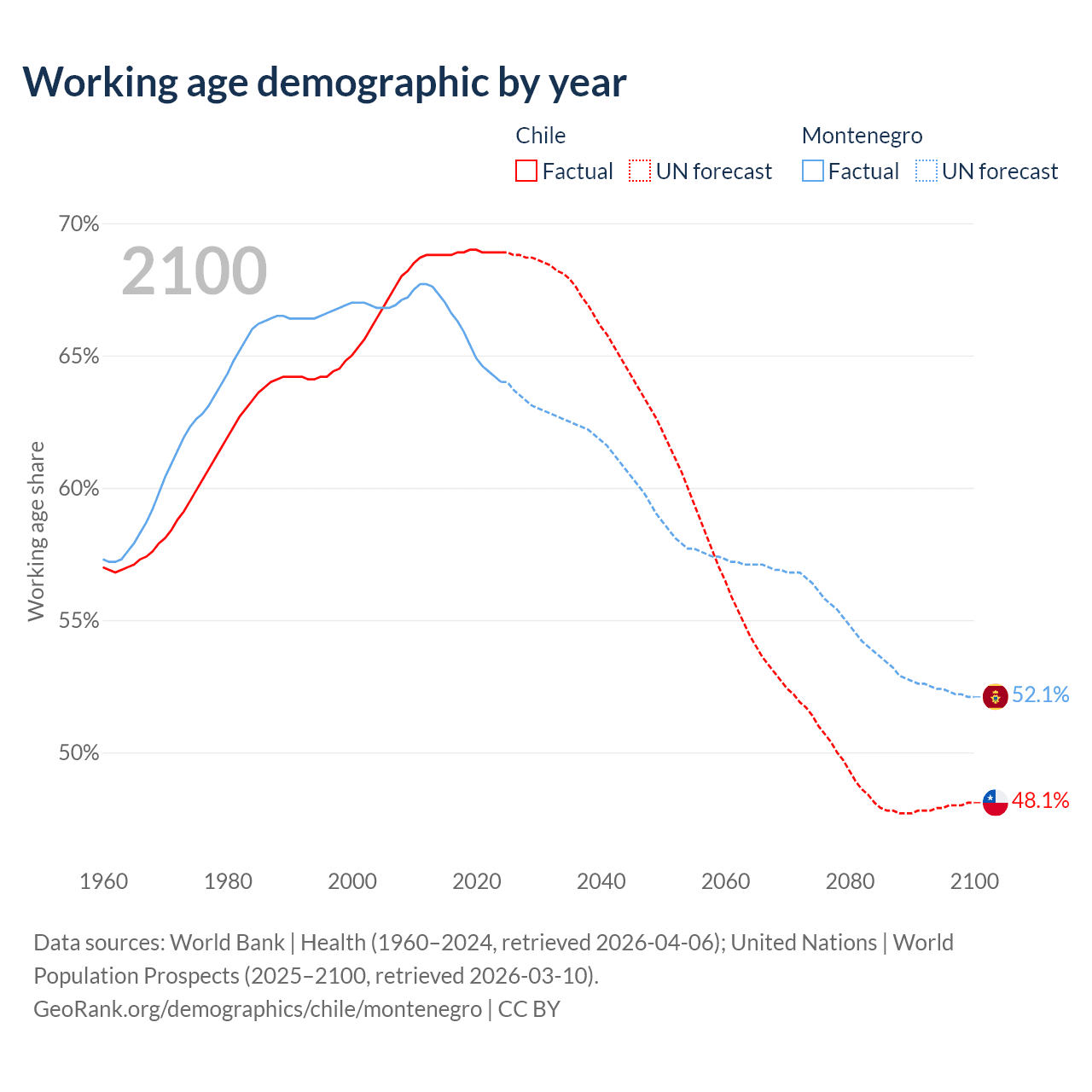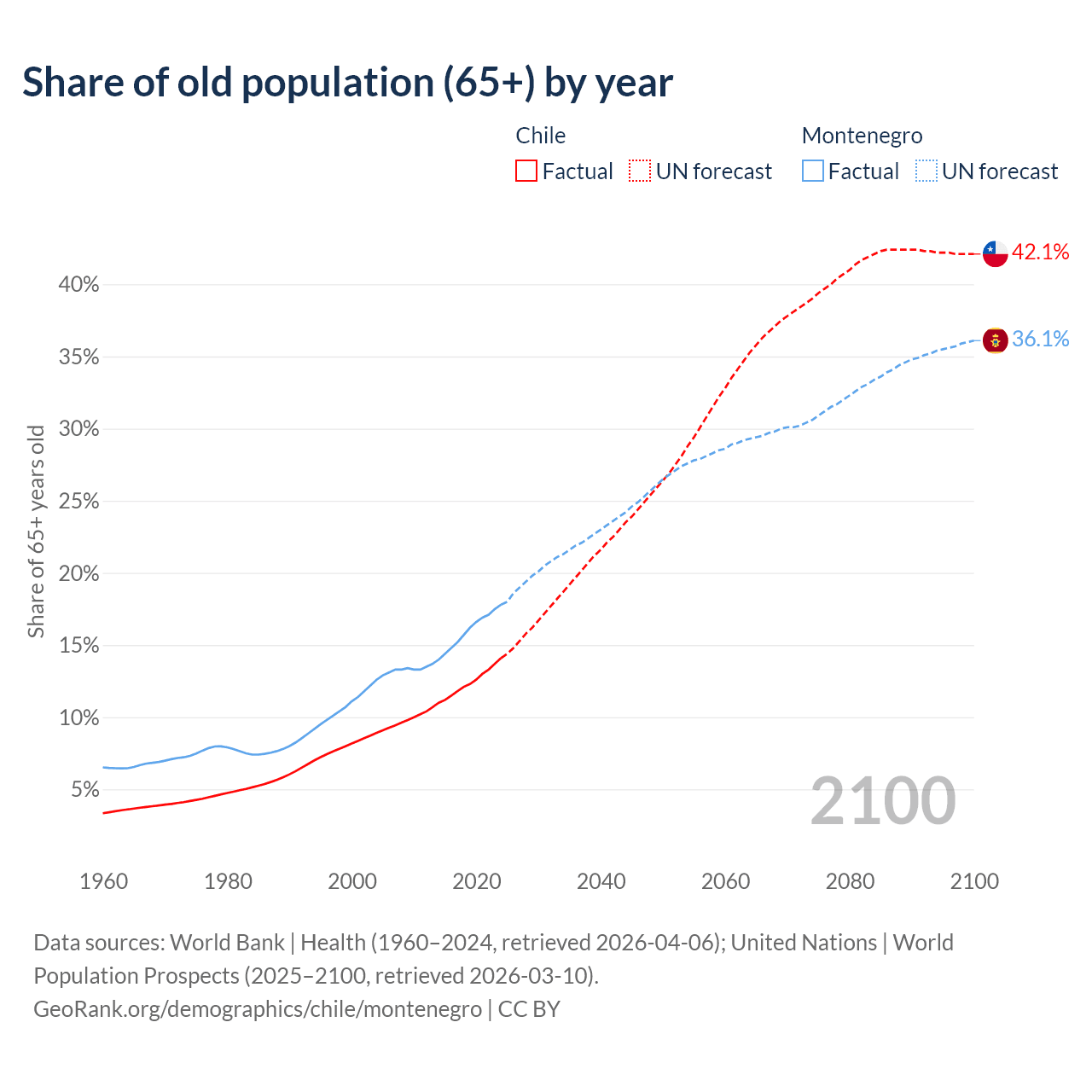 Median age Chile vs Montenegro, 1960-2100