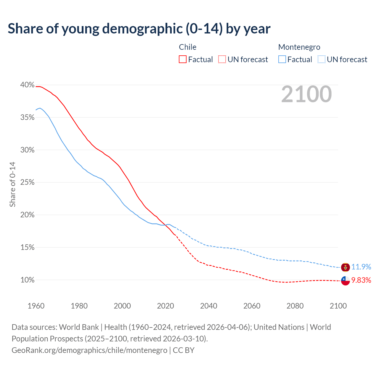- The share of young demographic (0-15 years old) in Chile is 17% vs 18.1% in Montenegro.
