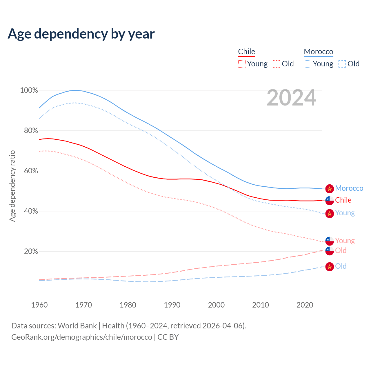 - Chile is ranked 61/196 by median age (oldest to youngest) vs 100/196 for Morocco.