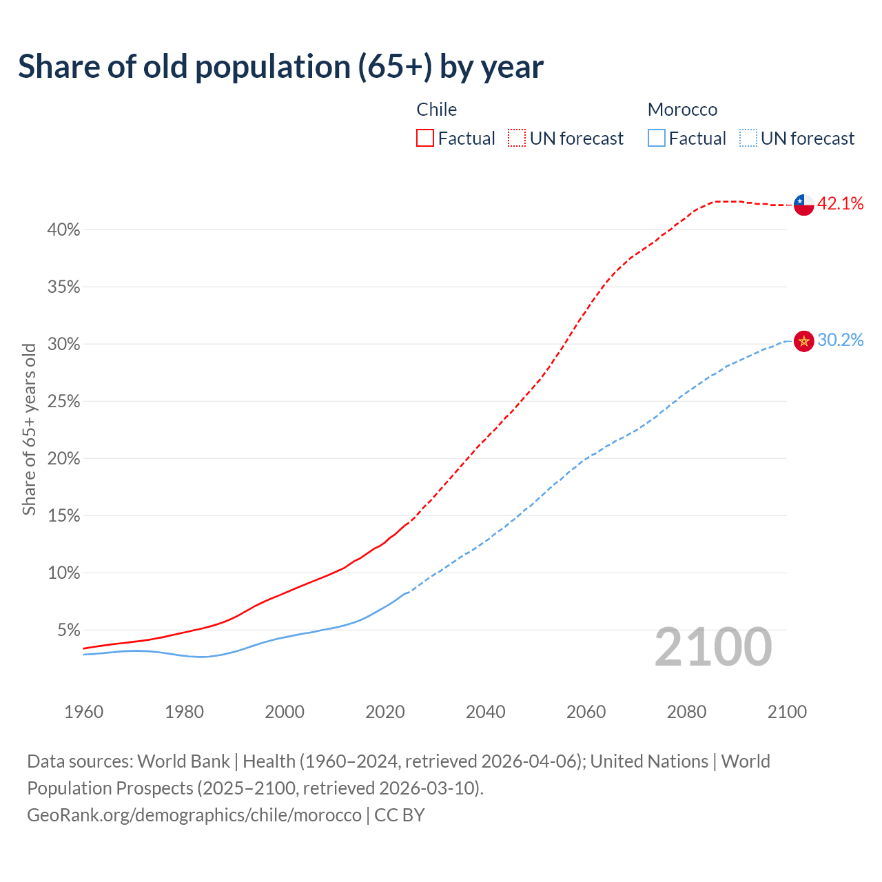 - The share of old-age demographic (65+) in Chile is 14.1% vs 8.14% in Morocco.