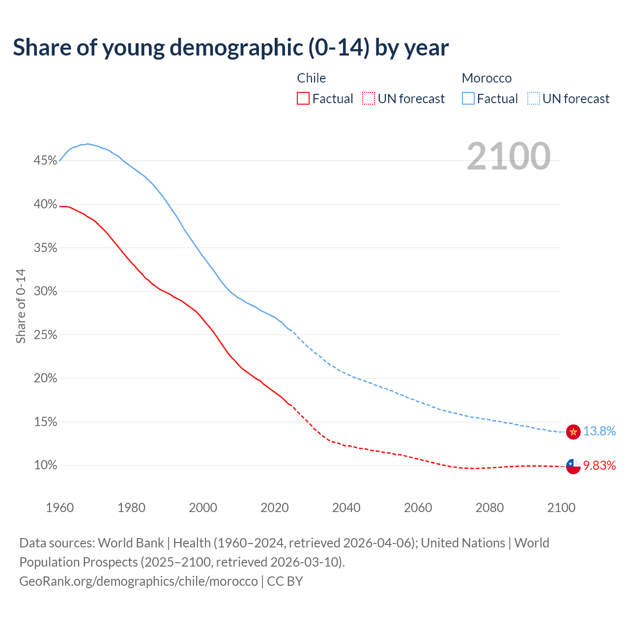 - The share of young demographic (0-15 years old) in Chile is 17% vs 25.6% in Morocco.