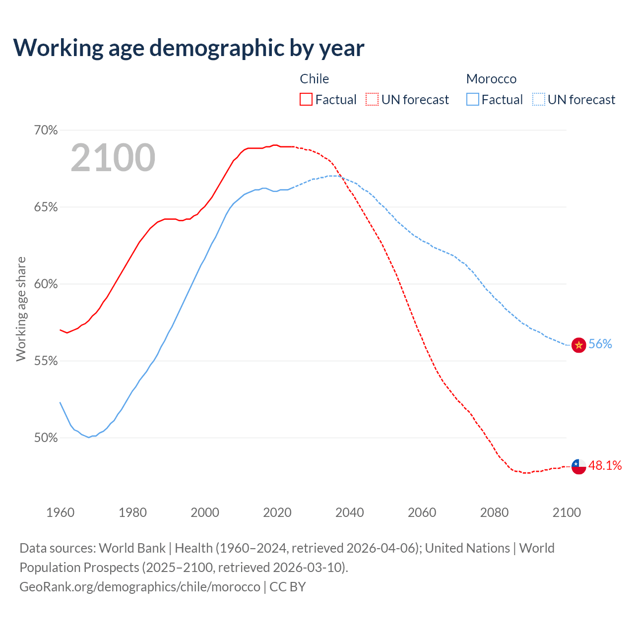 - Chile has 13.8M working age adults (aged 15-64) vs 25.7M in Morocco.