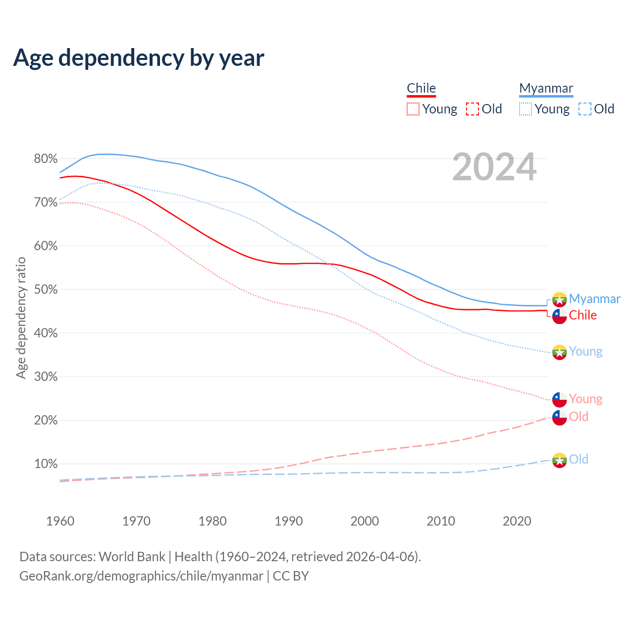- Chile is ranked 61/196 by median age (oldest to youngest) vs 96/196 for Myanmar.