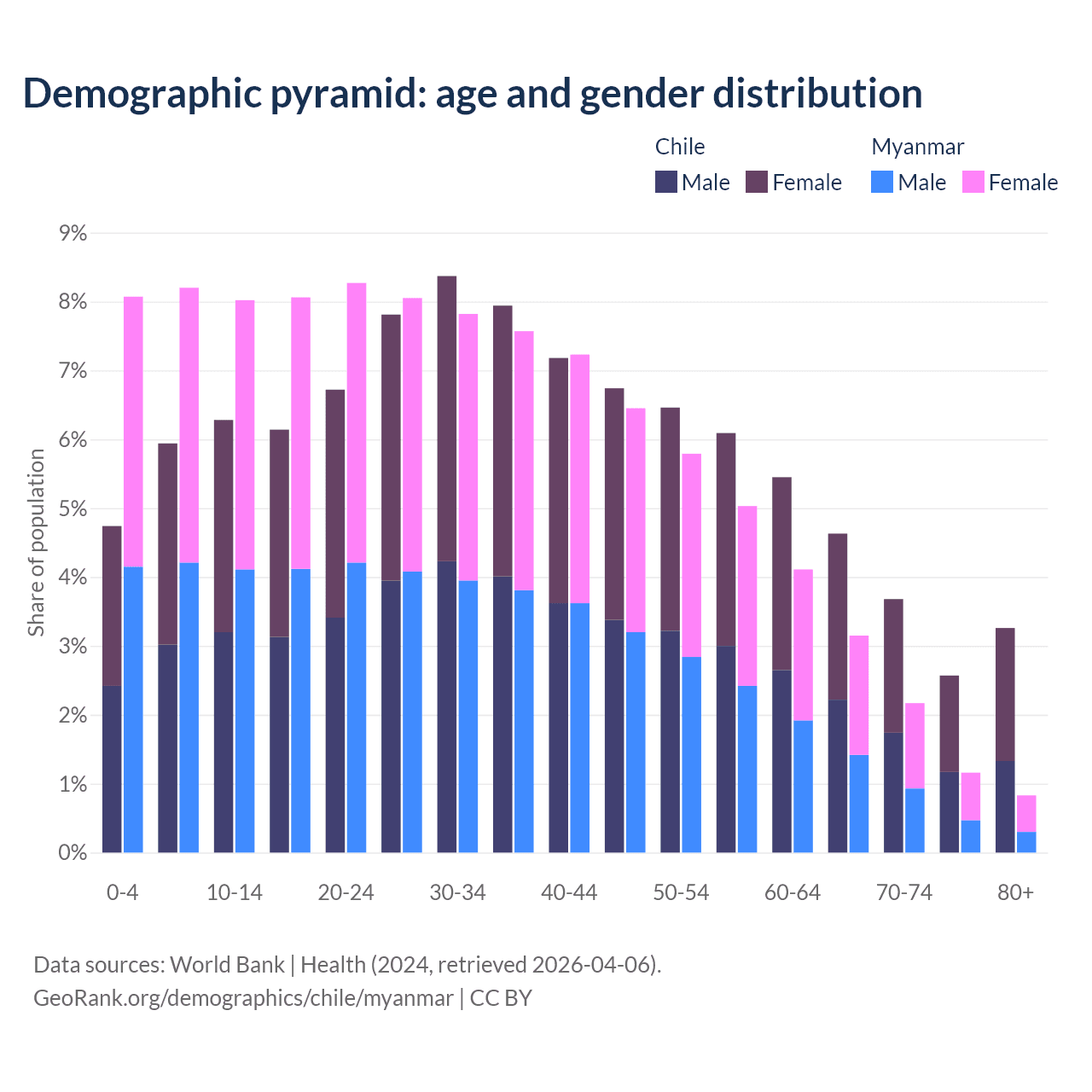 - The median age in Chile is 37.5 years compared to 30.8 years in Myanmar.