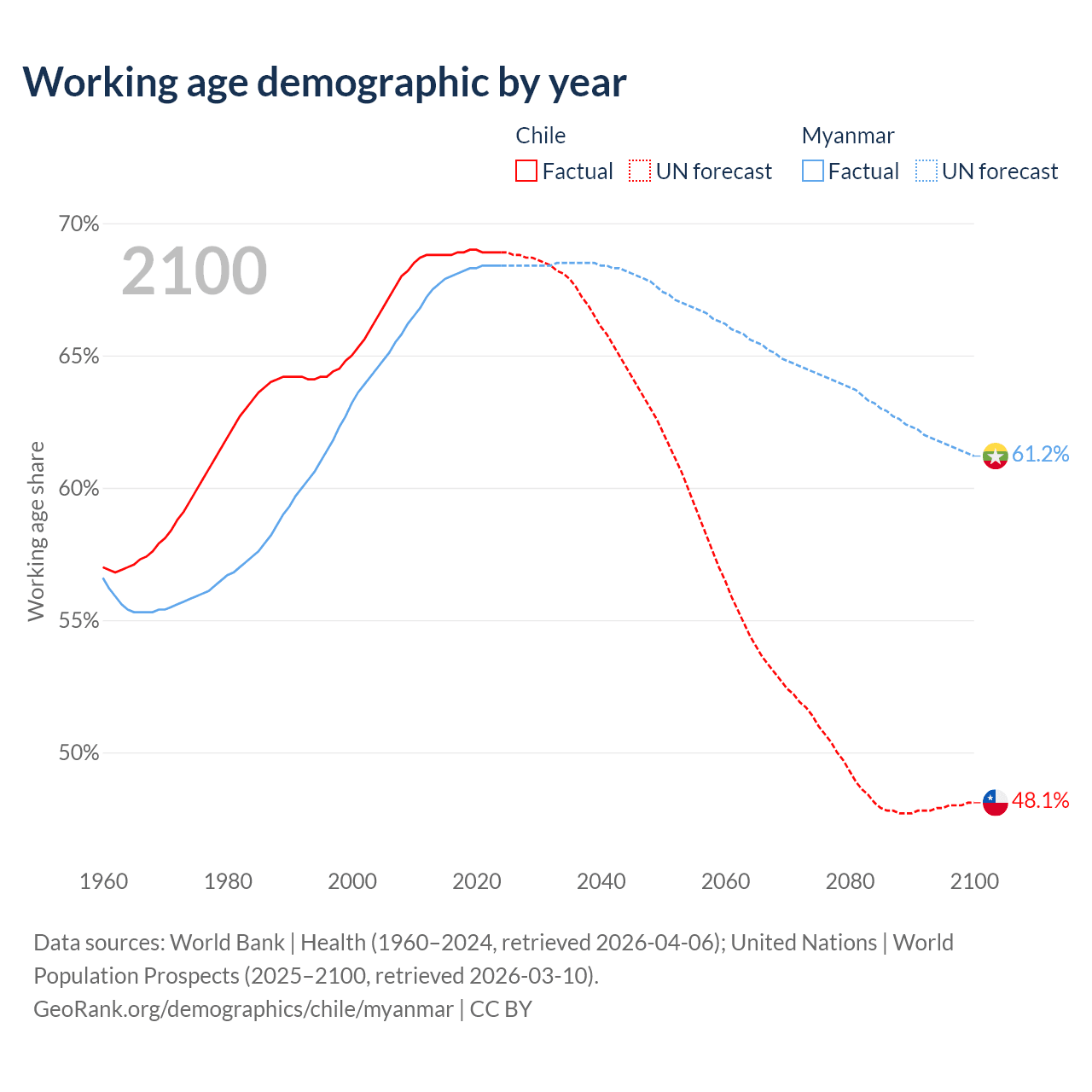 - Chile has 13.8M working age adults (aged 15-64) vs 37.8M in Myanmar.