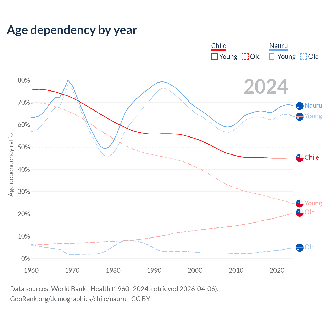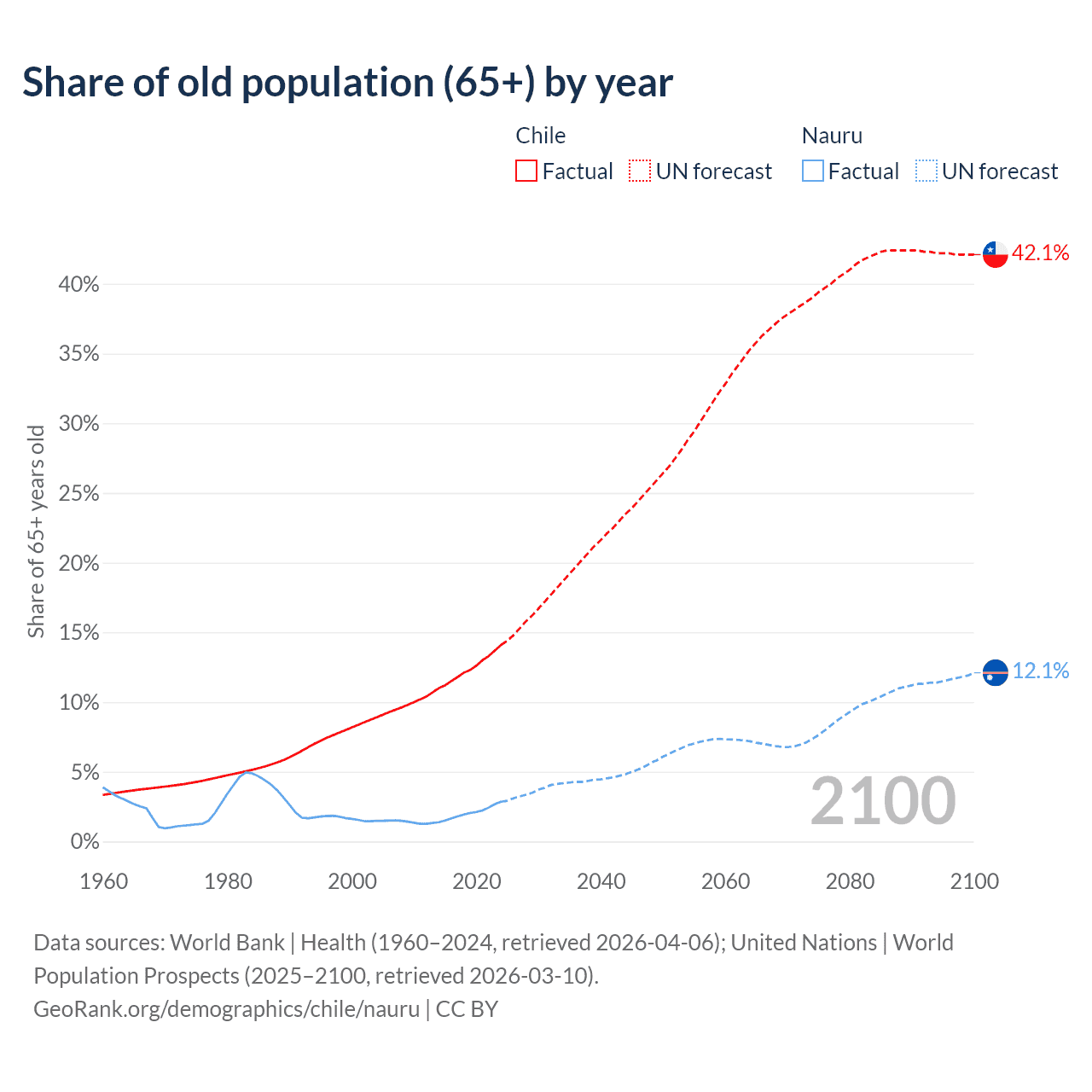 - The share of old-age demographic (65+) in Chile is 14.1% vs 2.85% in Nauru.