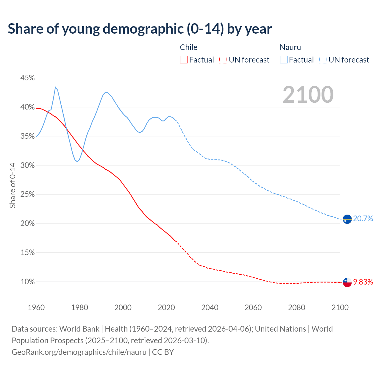 - The share of young demographic (0-15 years old) in Chile is 17% vs 37.8% in Nauru.