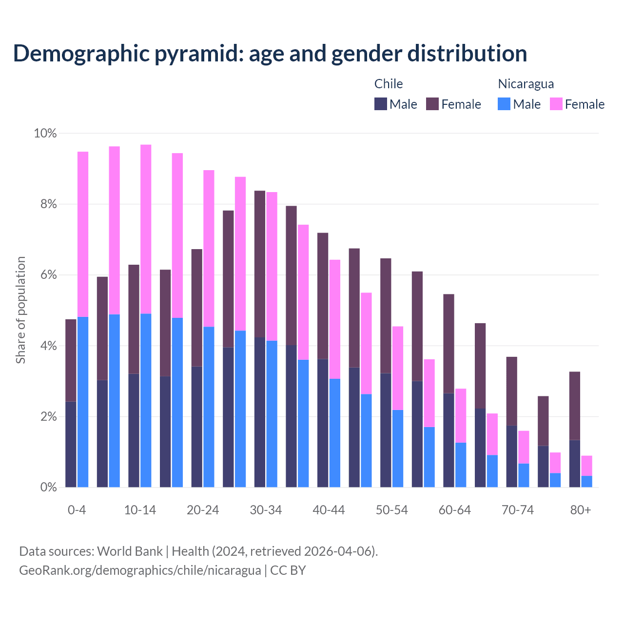 - The share of old-age demographic (65+) in Chile is 14.1% vs 5.53% in Nicaragua.