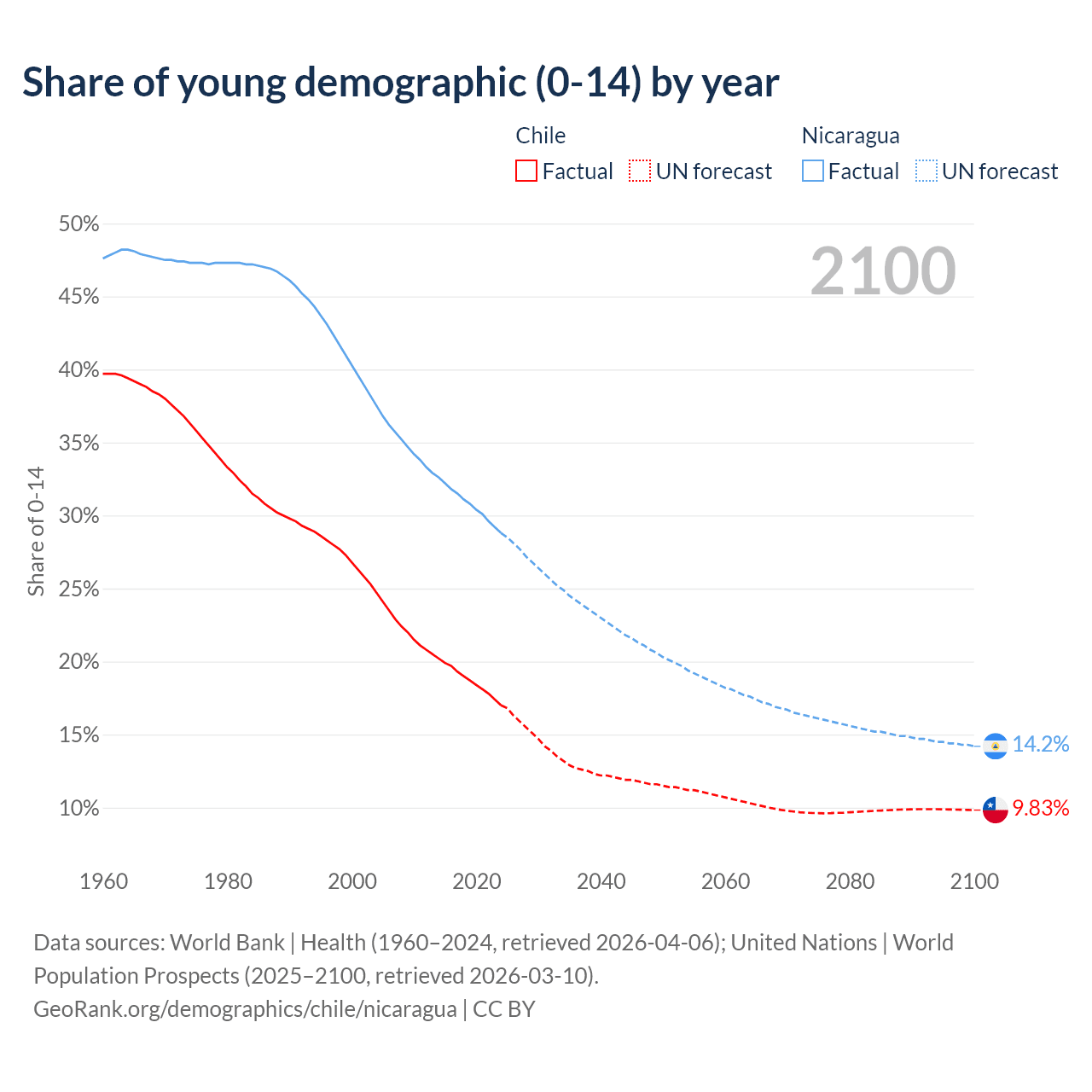 Median age Chile vs Nicaragua, 1960-2100