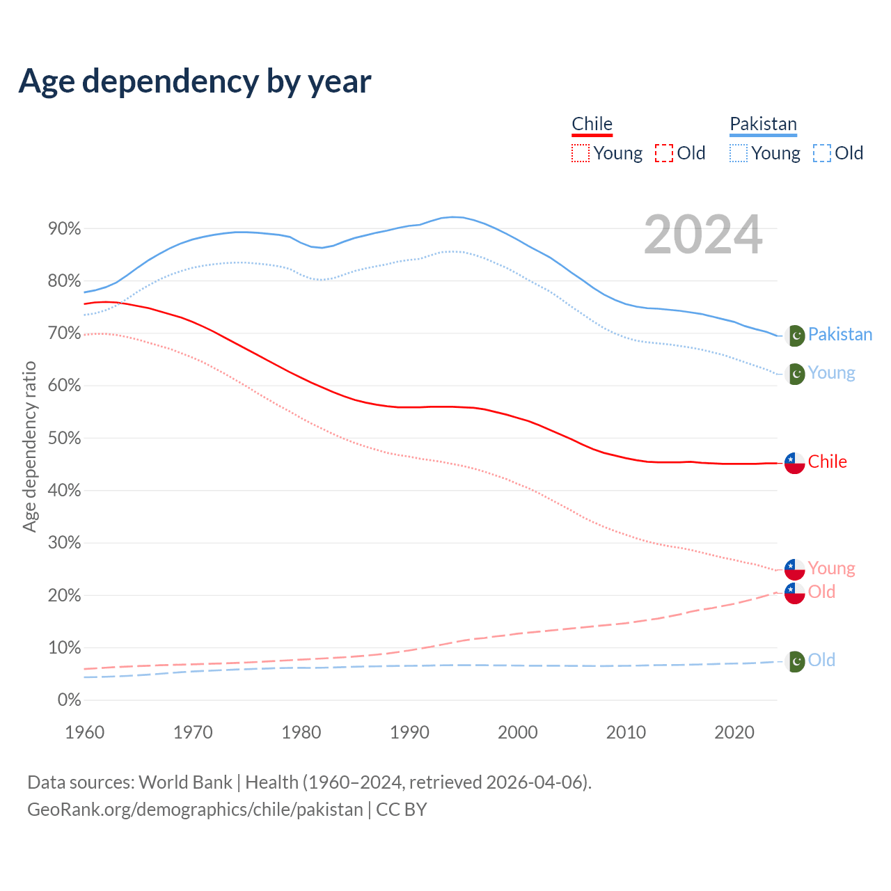 - The share of old-age demographic (65+) in Chile is 14.1% vs 4.28% in Pakistan.