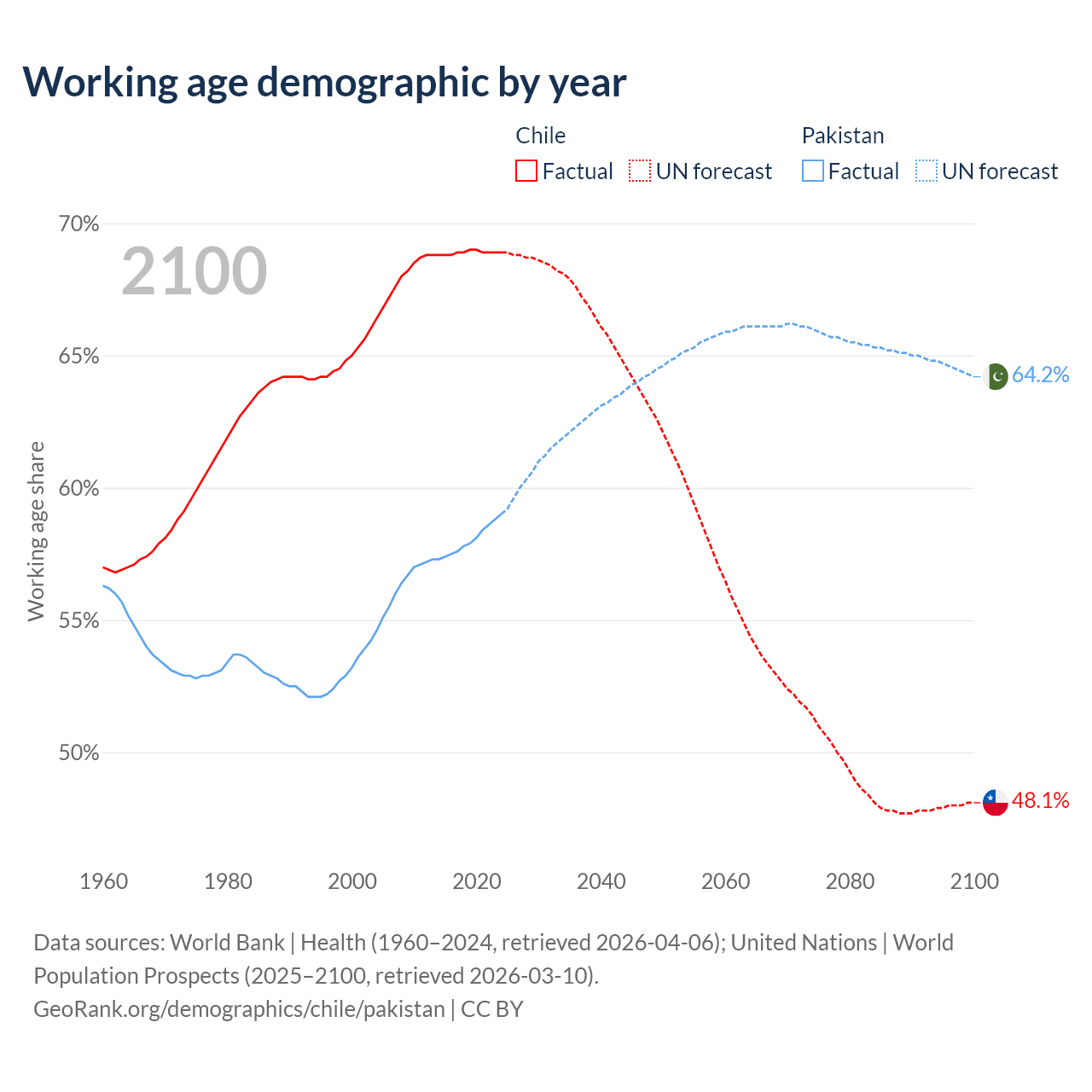 - Chile has 13.8M working age adults (aged 15-64) vs 154M in Pakistan.