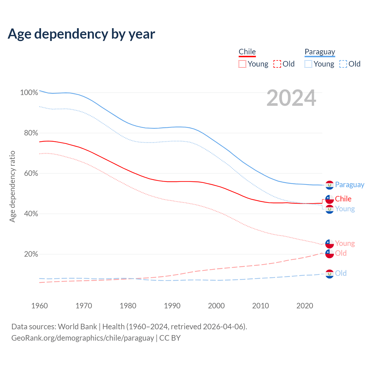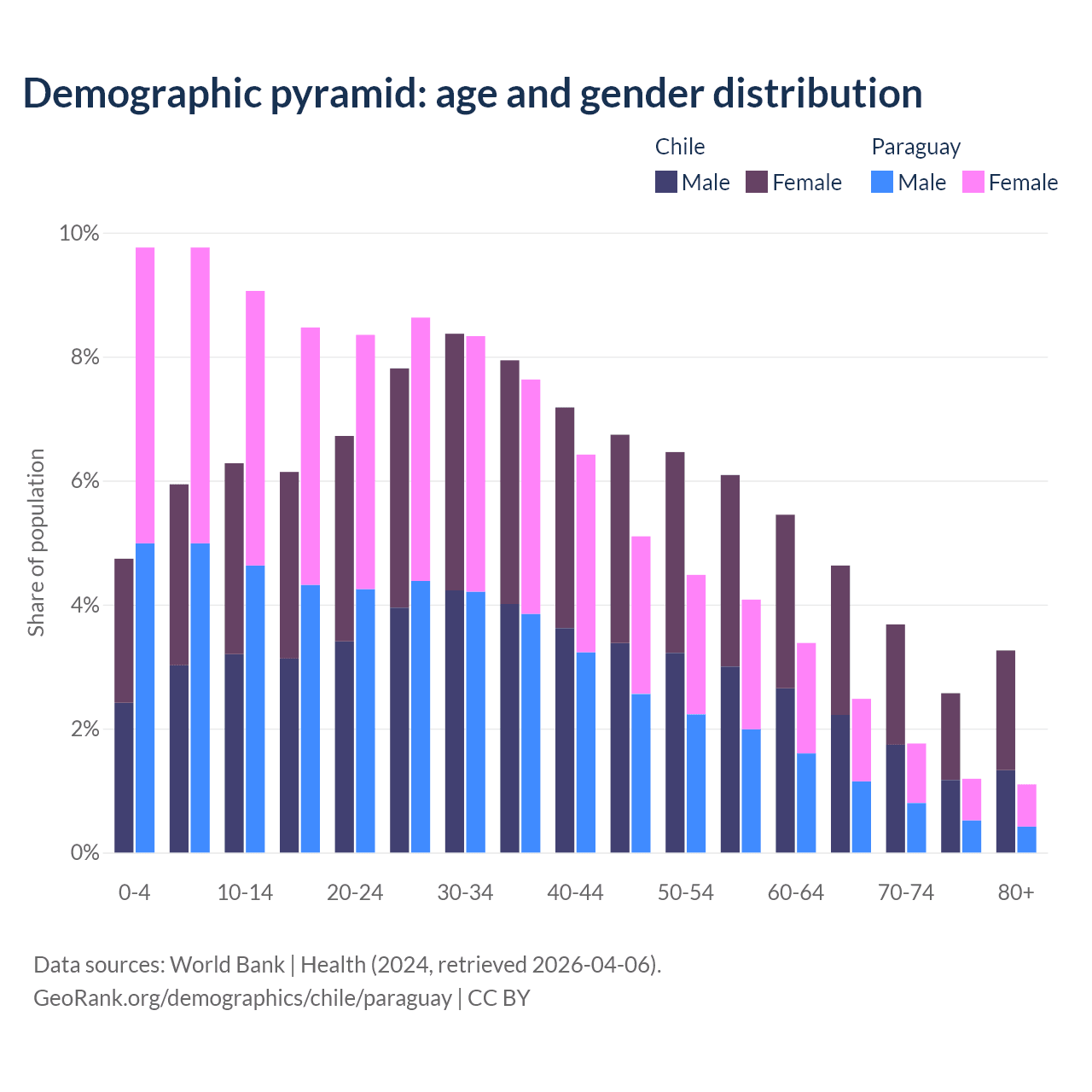 - Chile is ranked 61/196 by median age (oldest to youngest) vs 118/196 for Paraguay.