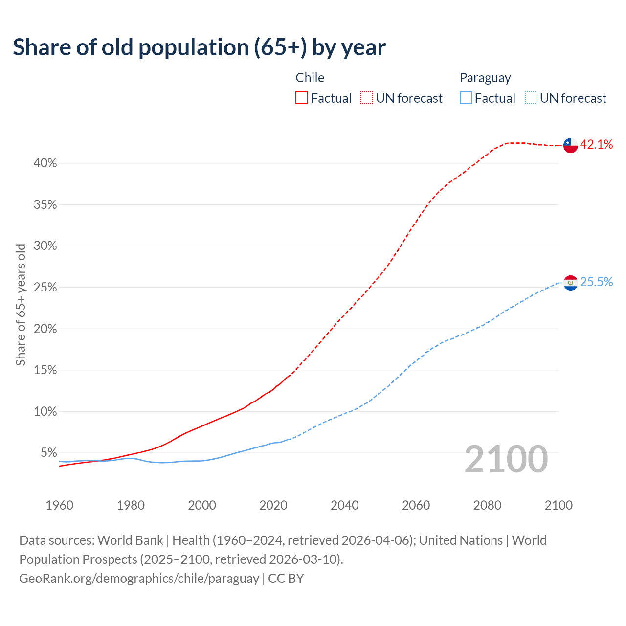 The share of older people aged 65 and over is 14.1% in Chile and 6.54% in Paraguay. Life expectancy in Chile compared to Paraguay .